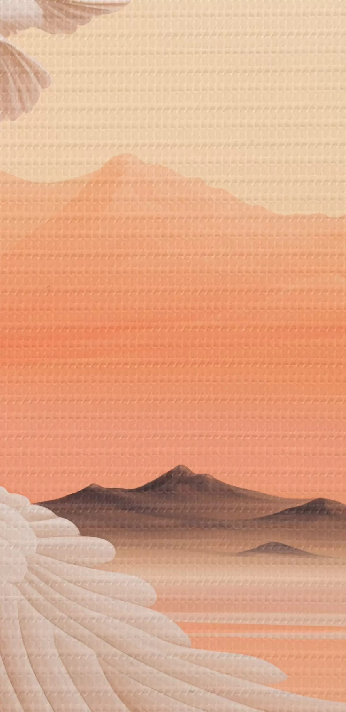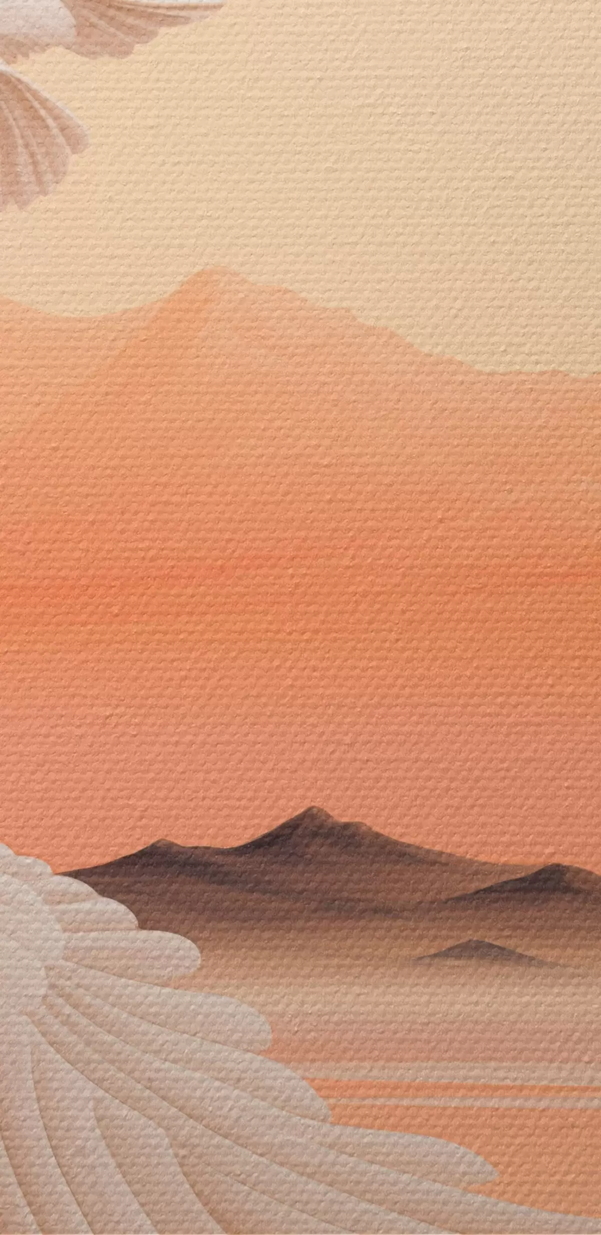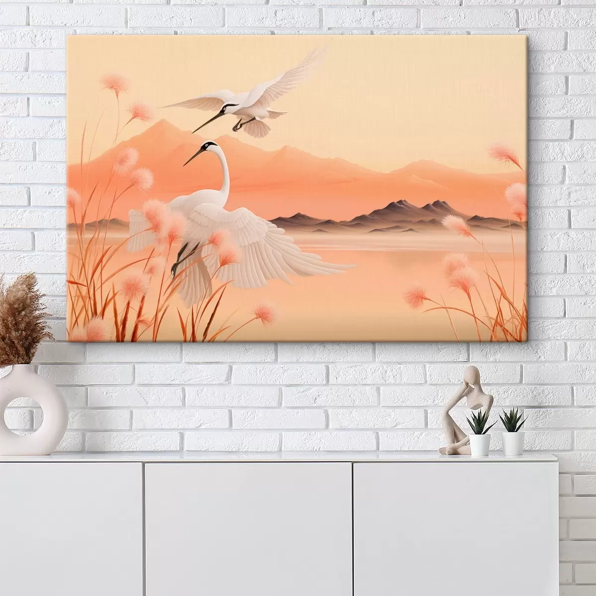 Gemälde Weiße Kraniche mit rosa Schilf im Vordergrund, Berge und ein See im Hintergrund, weiches orangefarbenes Licht Art. s44925