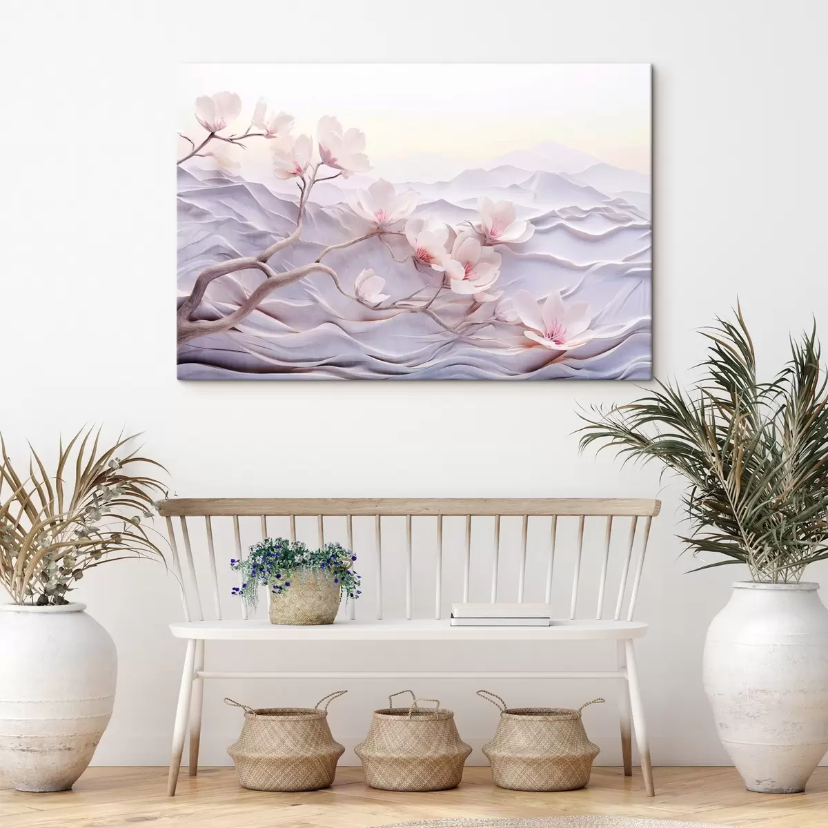 Gemälde Blütenzweig mit rosa Blumen, Berge im Hintergrund, weiche Pastellfarben, japanische Strukturkunst Art. s44930
