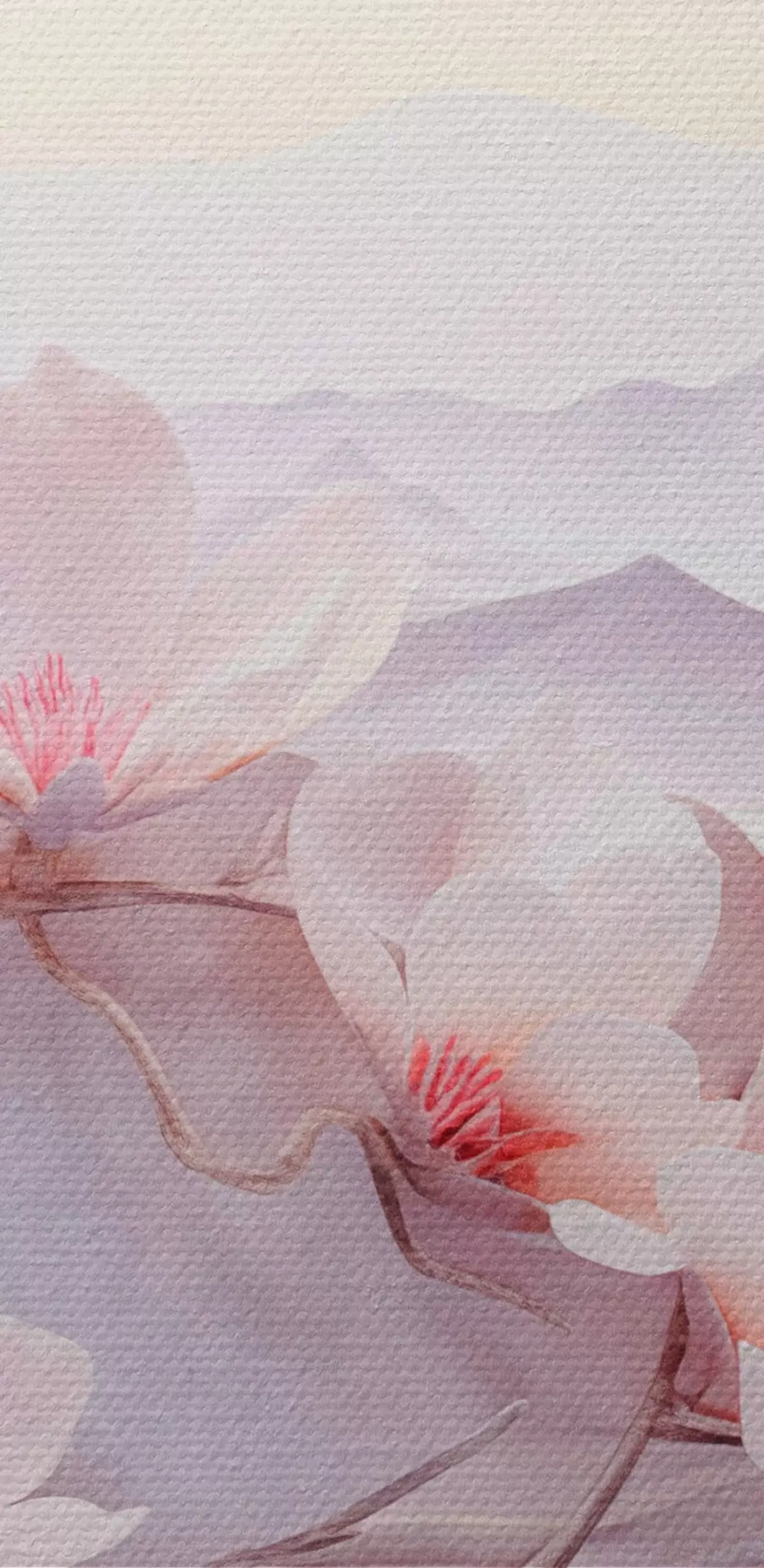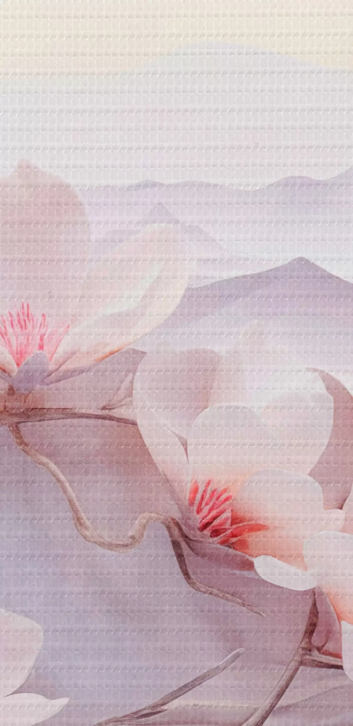 Fototapete Blütenzweig mit rosa Blumen, Berge im Hintergrund, weiche Pastellfarben, japanische Strukturkunst  s44930