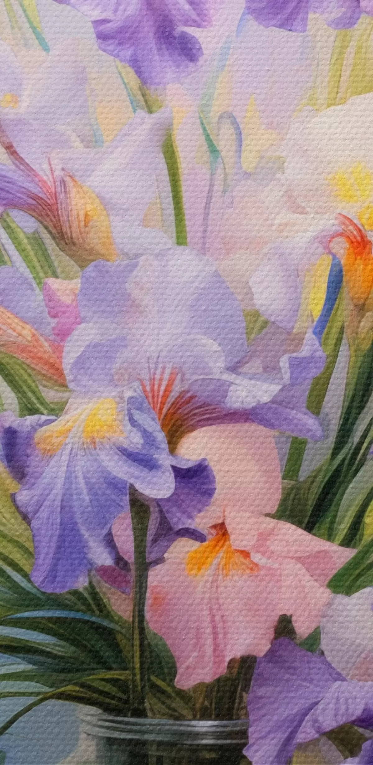 Gemälde Eine Vase mit vielen pastellfarbenen Schwertlilien, einige Blütenblätter auf dem Tisch verstreut, weicher pastellfarbener Hintergrund mit blauen und rosa Tönen Art. s44933