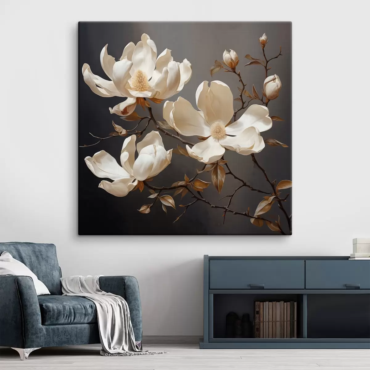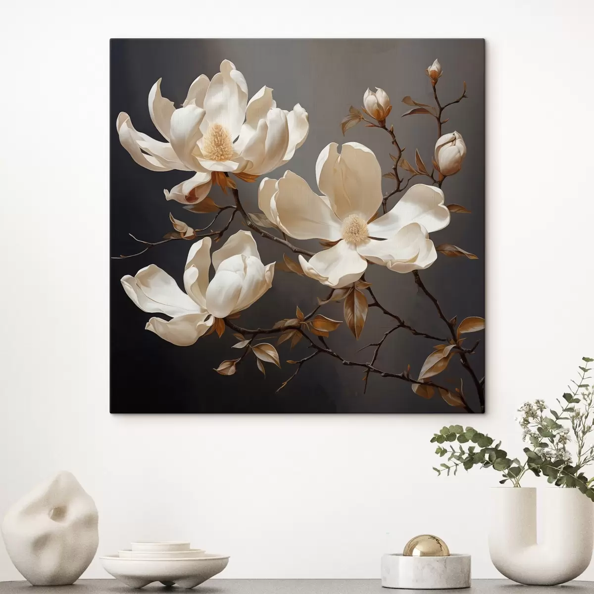 Gemälde Weiße Magnolien auf dunklem Hintergrund im malerischen Stil Art. s45038