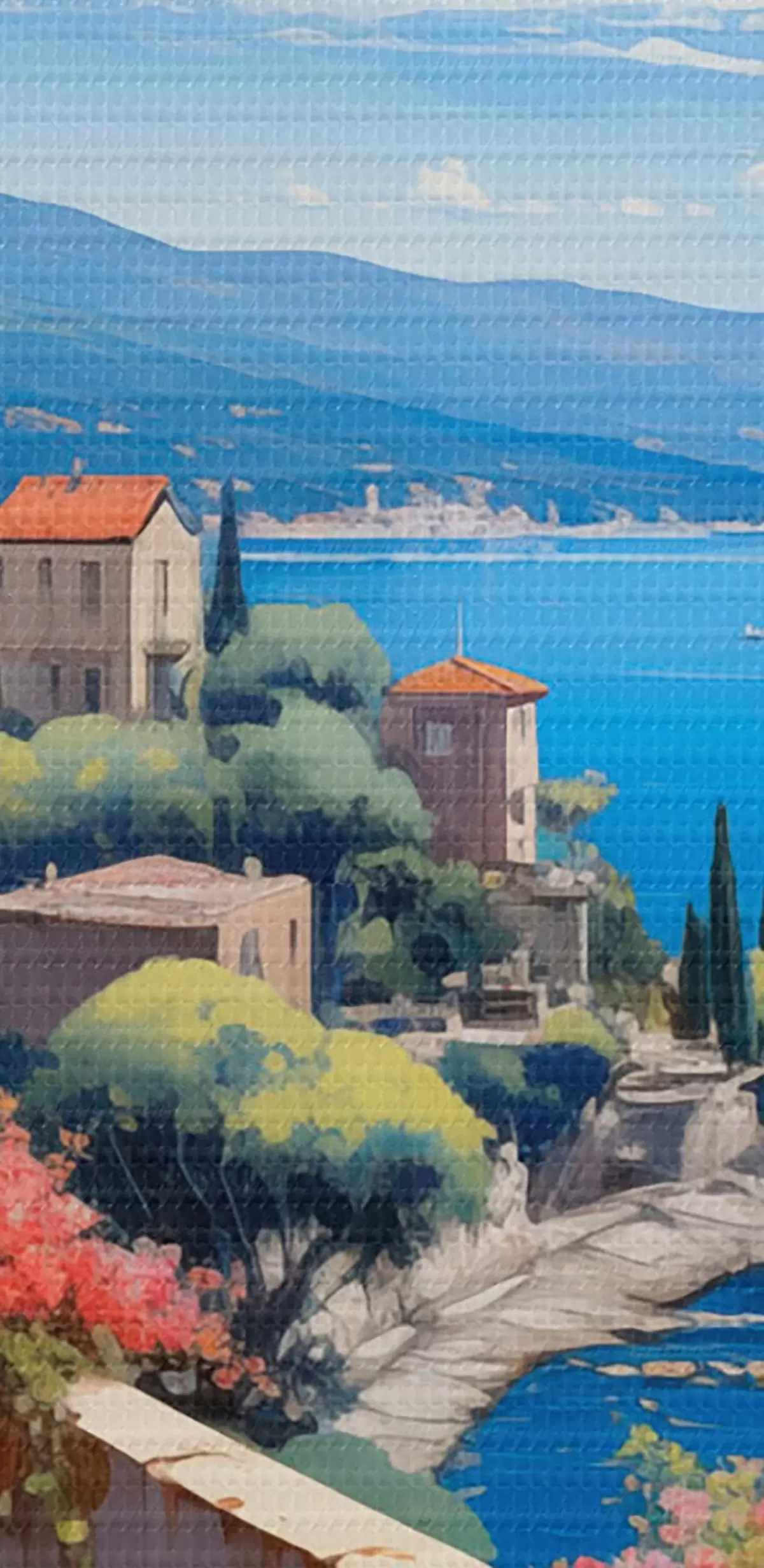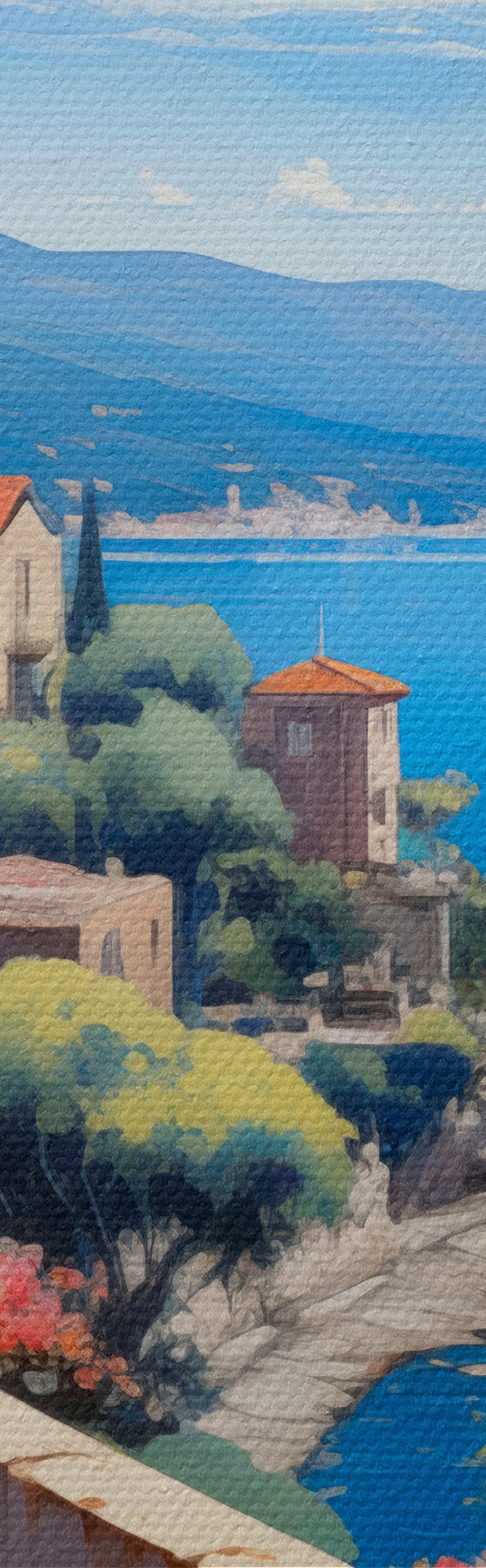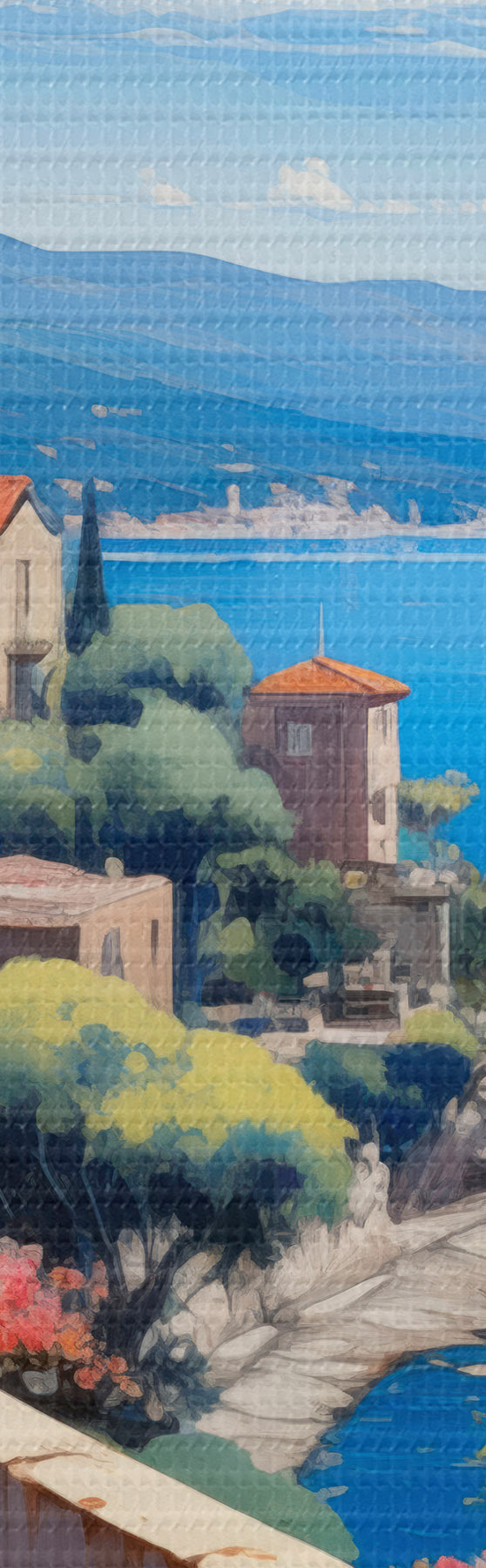 Fototapete Mediterrane Landschaft mit blühender Terrasse im künstlerischen Stil s45053