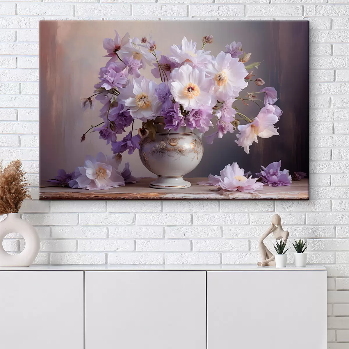 Gemälde Blumenstillleben: weiße und violette Blumen im künstlerischen Stil Art. s45058