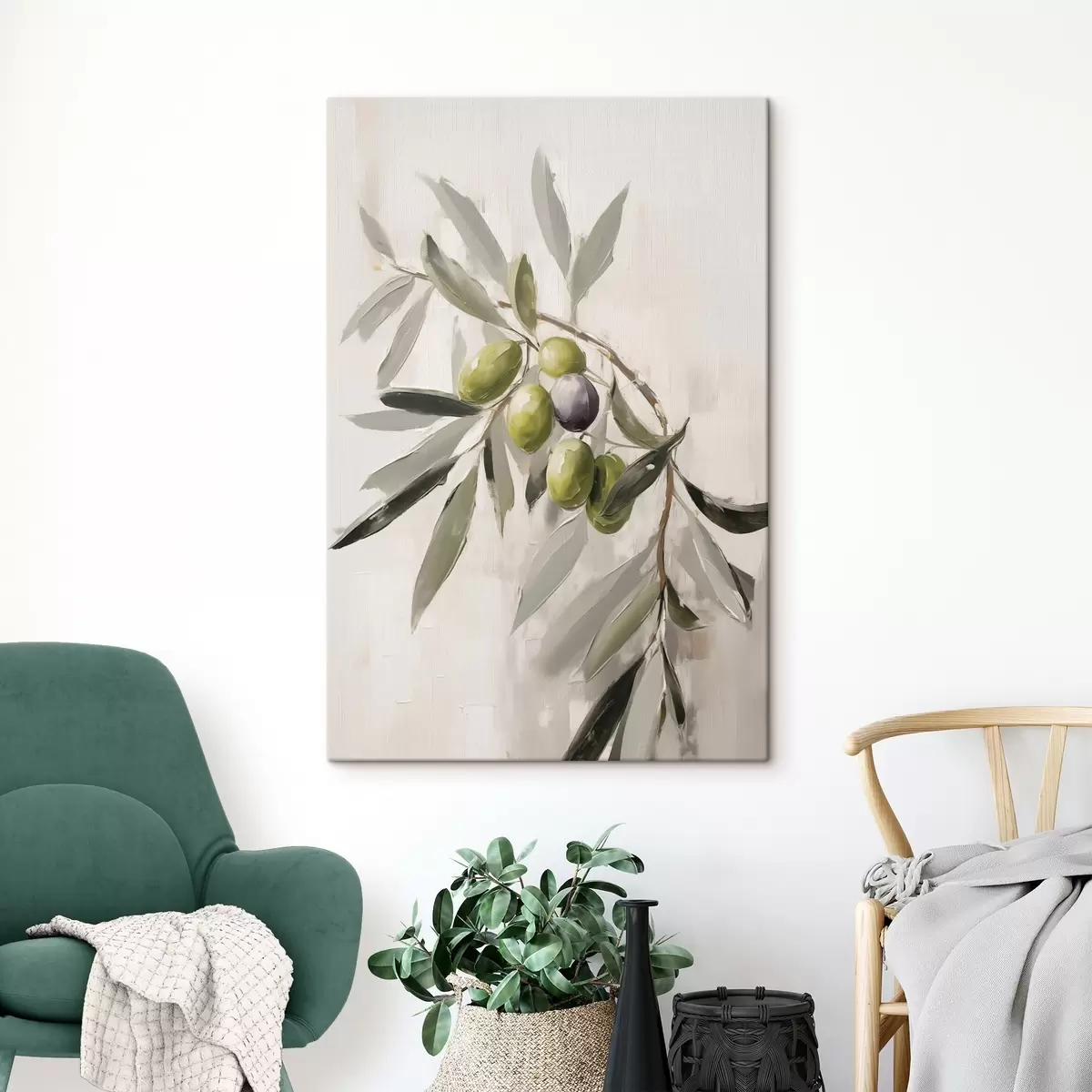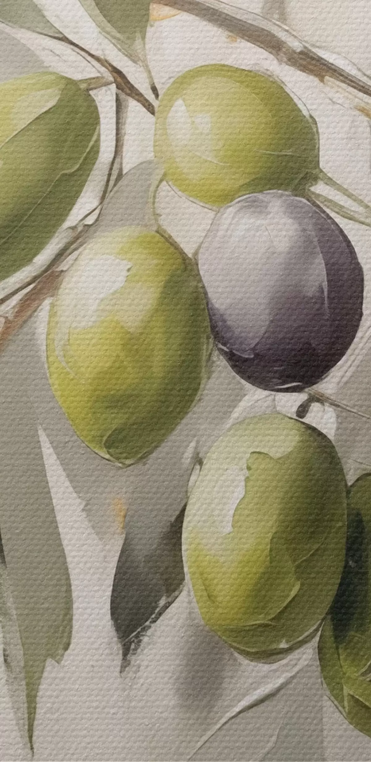Gemälde grüne Oliven, Zweigdetail, leichter Hintergrund, organisch, natürliche Palette, rustikal Art. s45110
