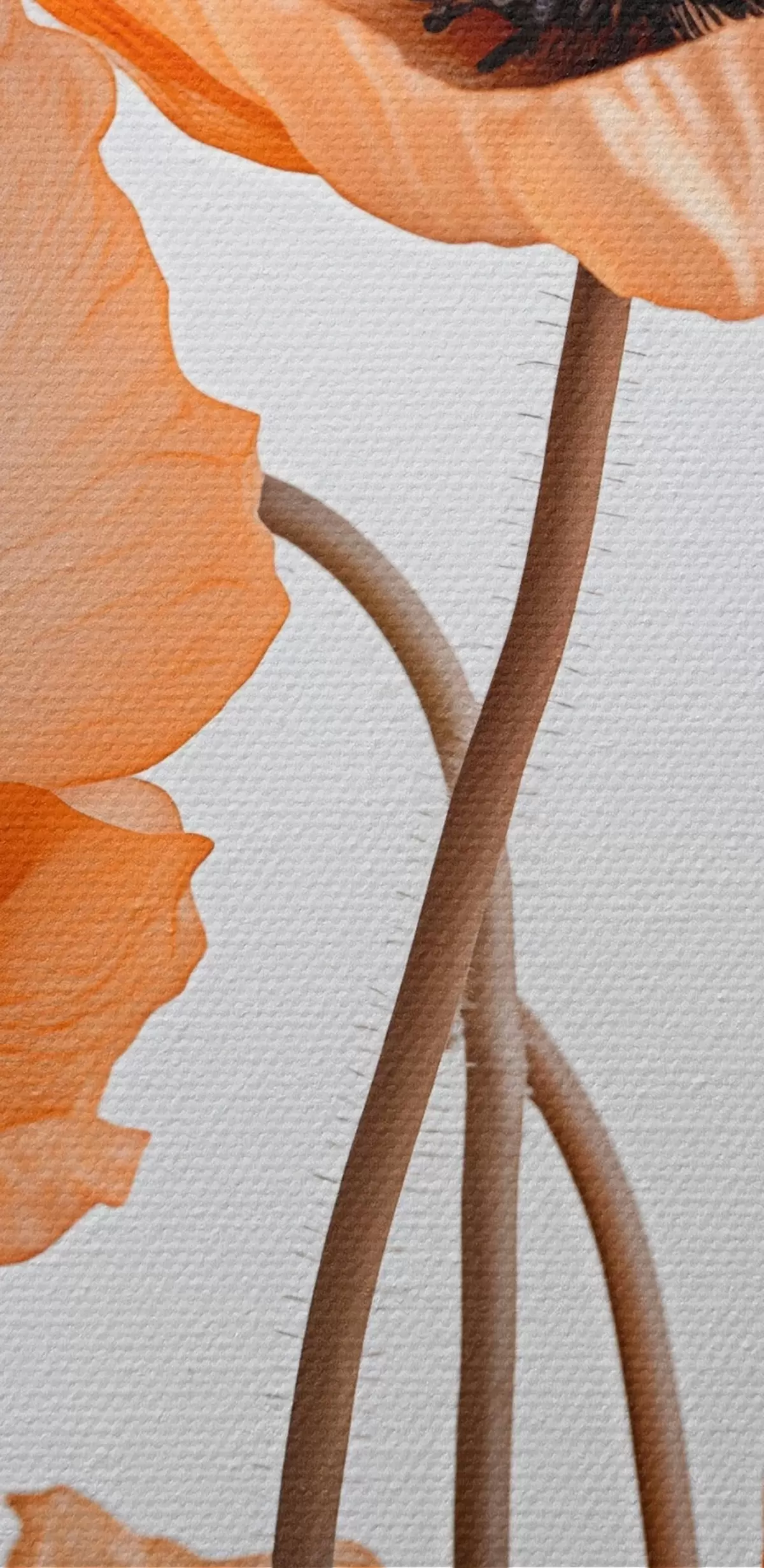 Gemälde Orangefarbene Mohnblumen, getrocknete Blumen vor einem hellen Hintergrund, weiche Beleuchtung, zarte Blütenblätter, Blumenarrangement Art. s45167