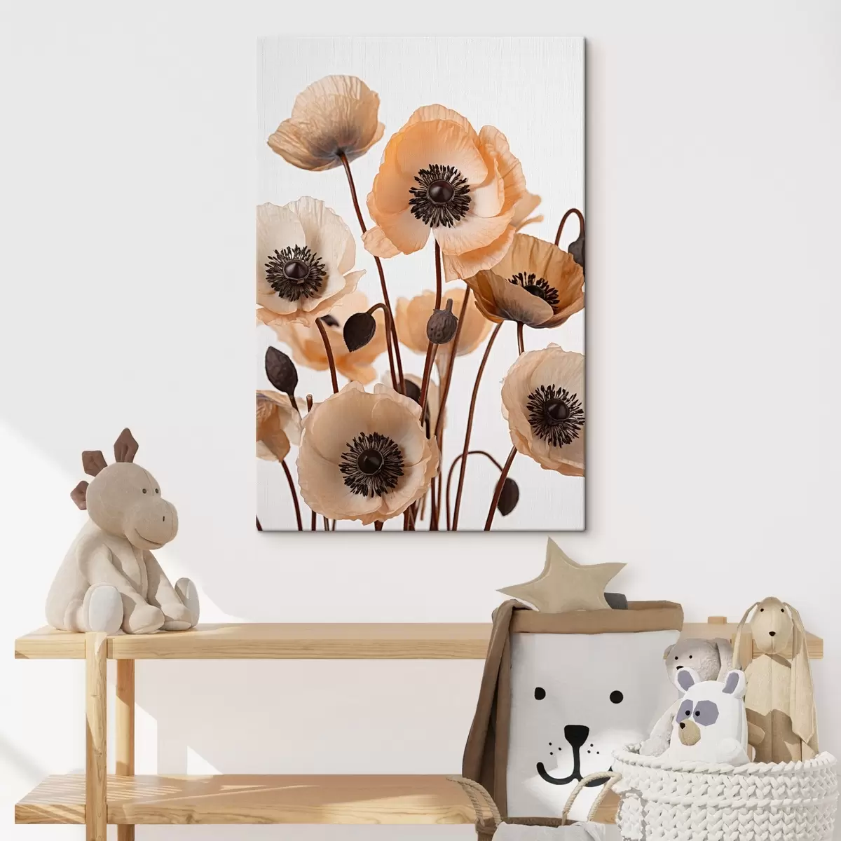 Gemälde Orangefarbene Mohnblumen, getrocknete Blumen vor einem hellen Hintergrund, weiche Beleuchtung, zarte Blütenblätter, Blumenarrangement Art. s45168