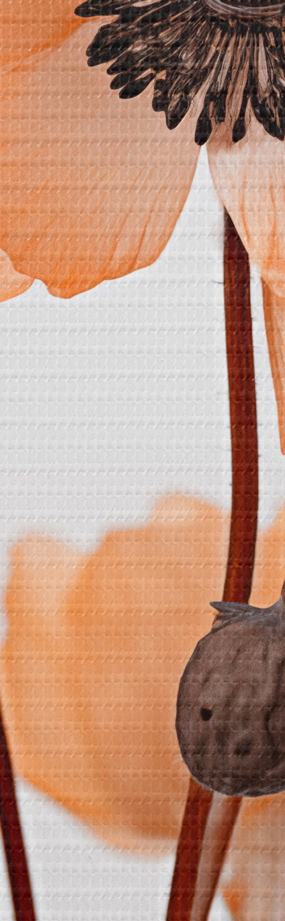 Fototapete Orangefarbene Mohnblumen, getrocknete Blumen vor einem hellen Hintergrund, weiche Beleuchtung, zarte Blütenblätter, Blumenarrangement s45168
