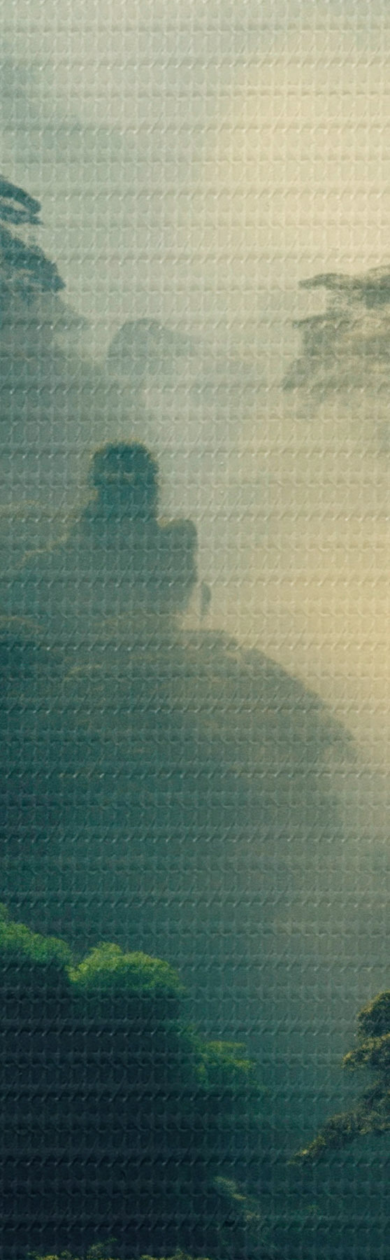 Fototapete Tropischer Regenwald mit üppig grünen Bäumen und einer dicken Nebelschicht, die eine stimmungsvolle Umgebung schafft s45190