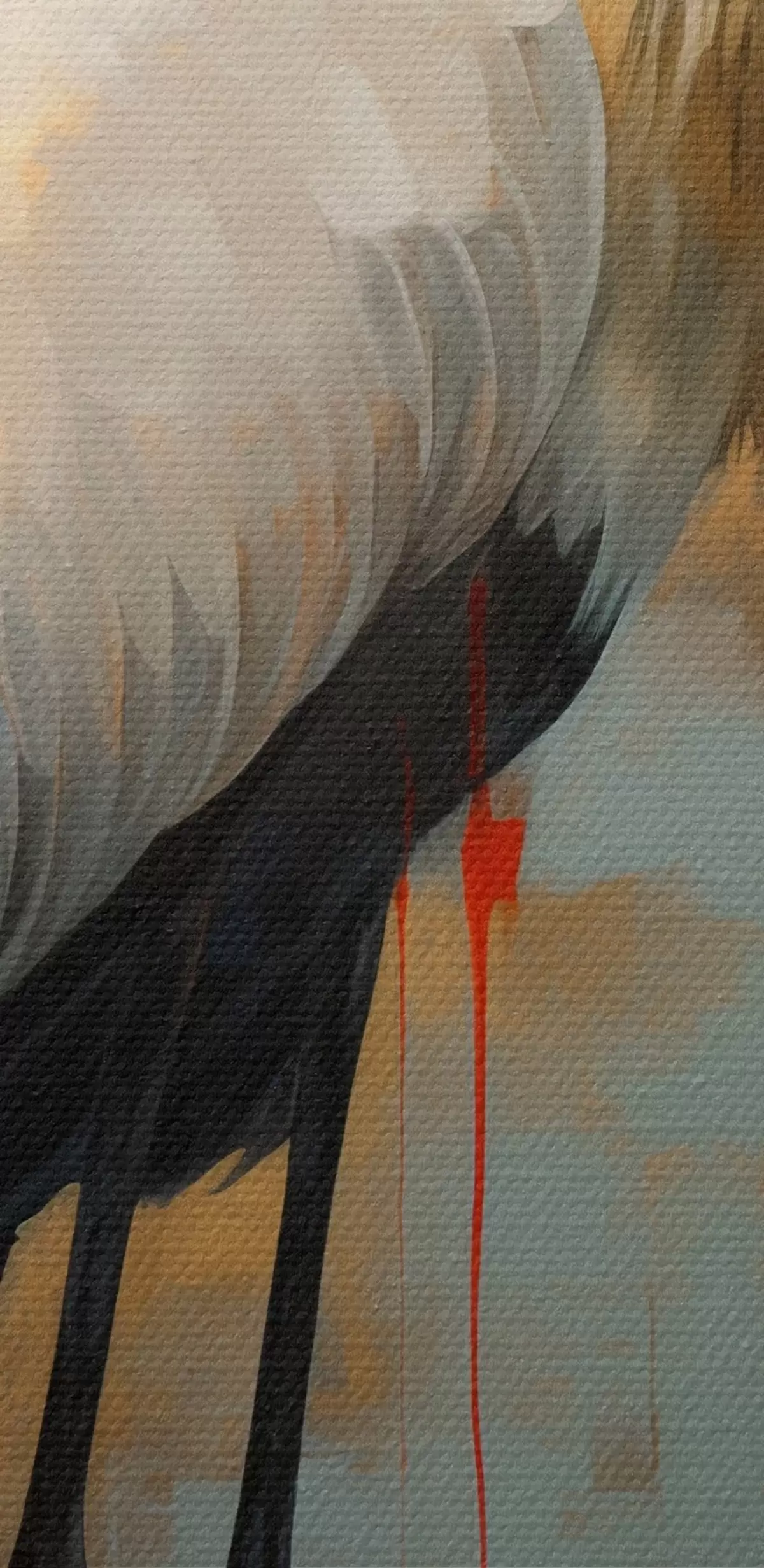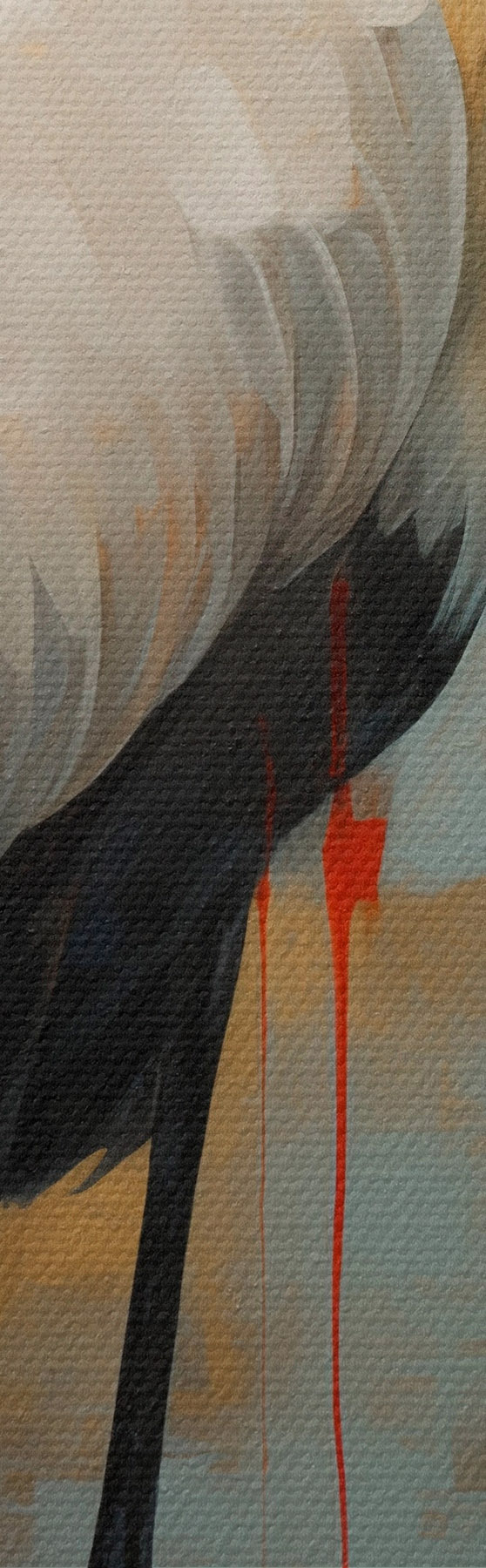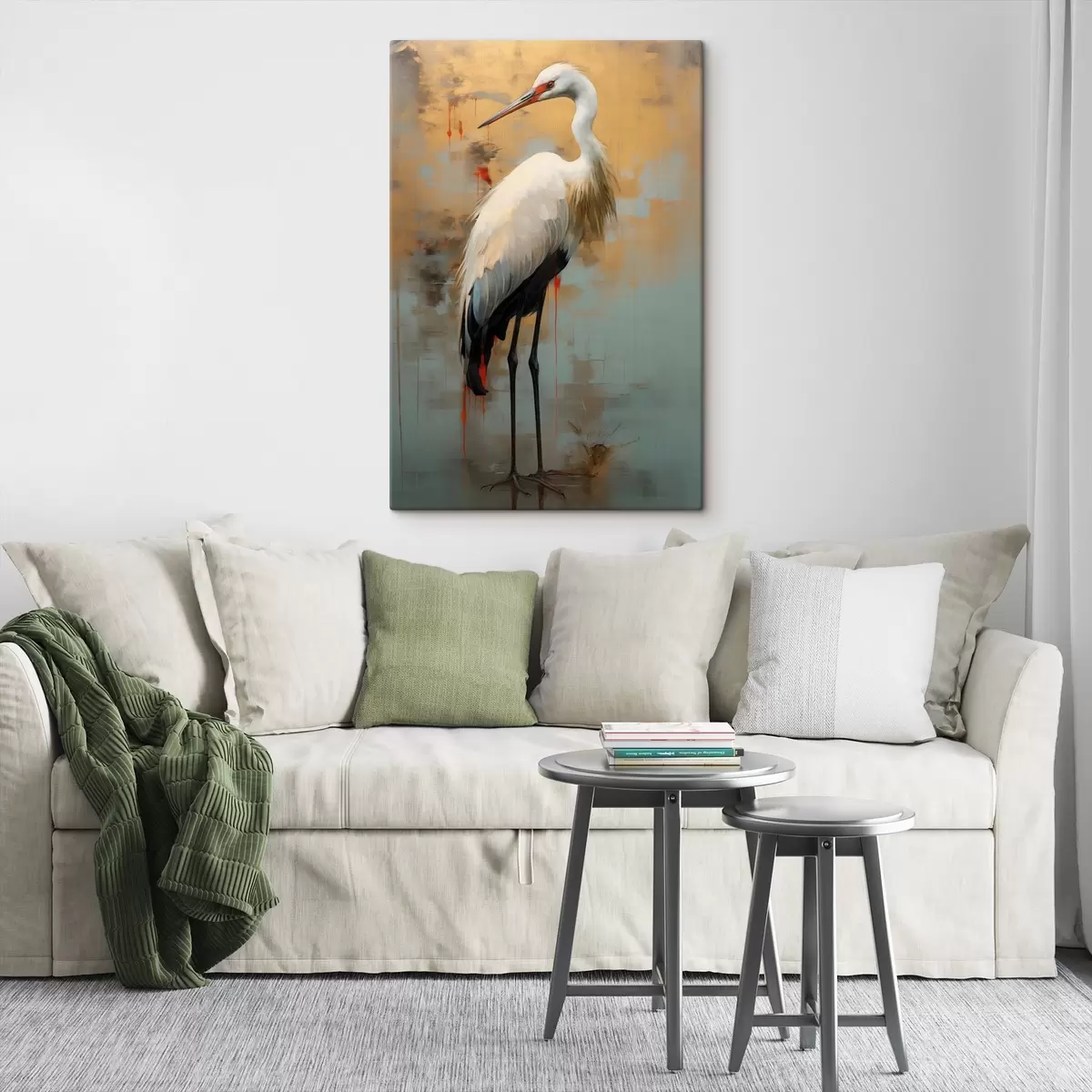 Gemälde Weißer Reiher vor einem Hintergrund aus gedämpften Gelb-, Braun- und Blautönen, der an eine neblige, abstrakte Landschaft erinnert Art. s45191