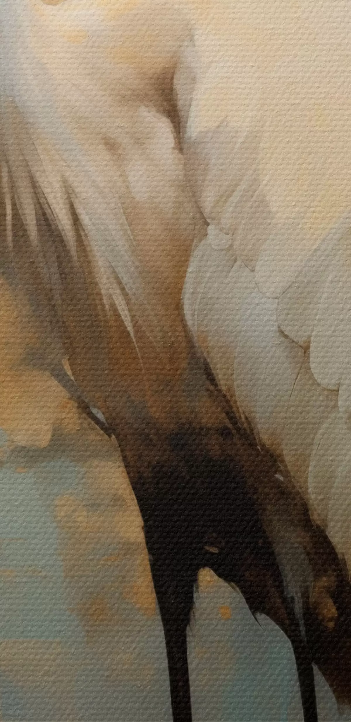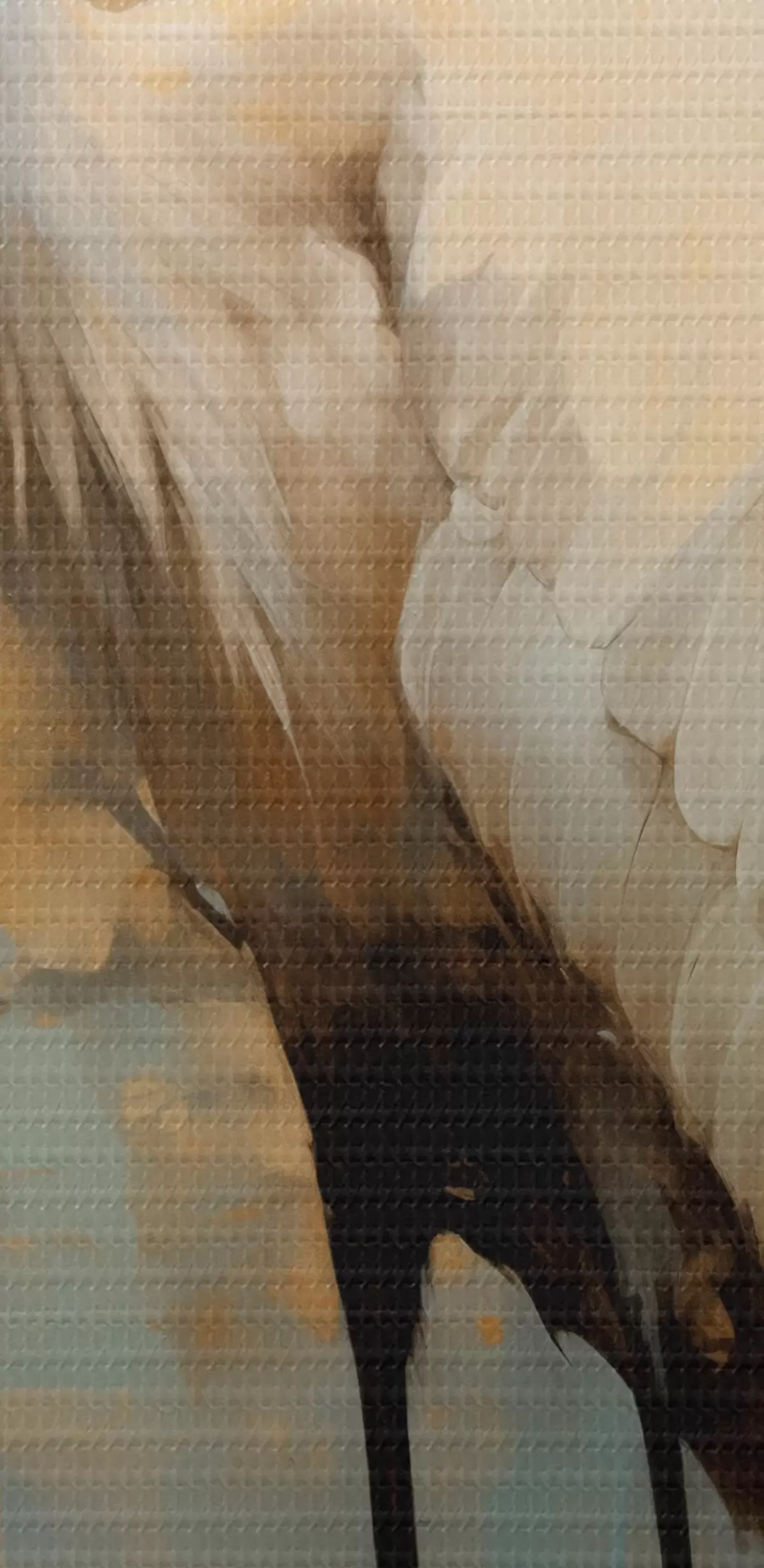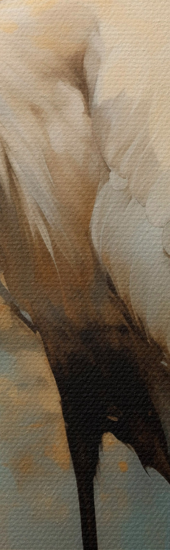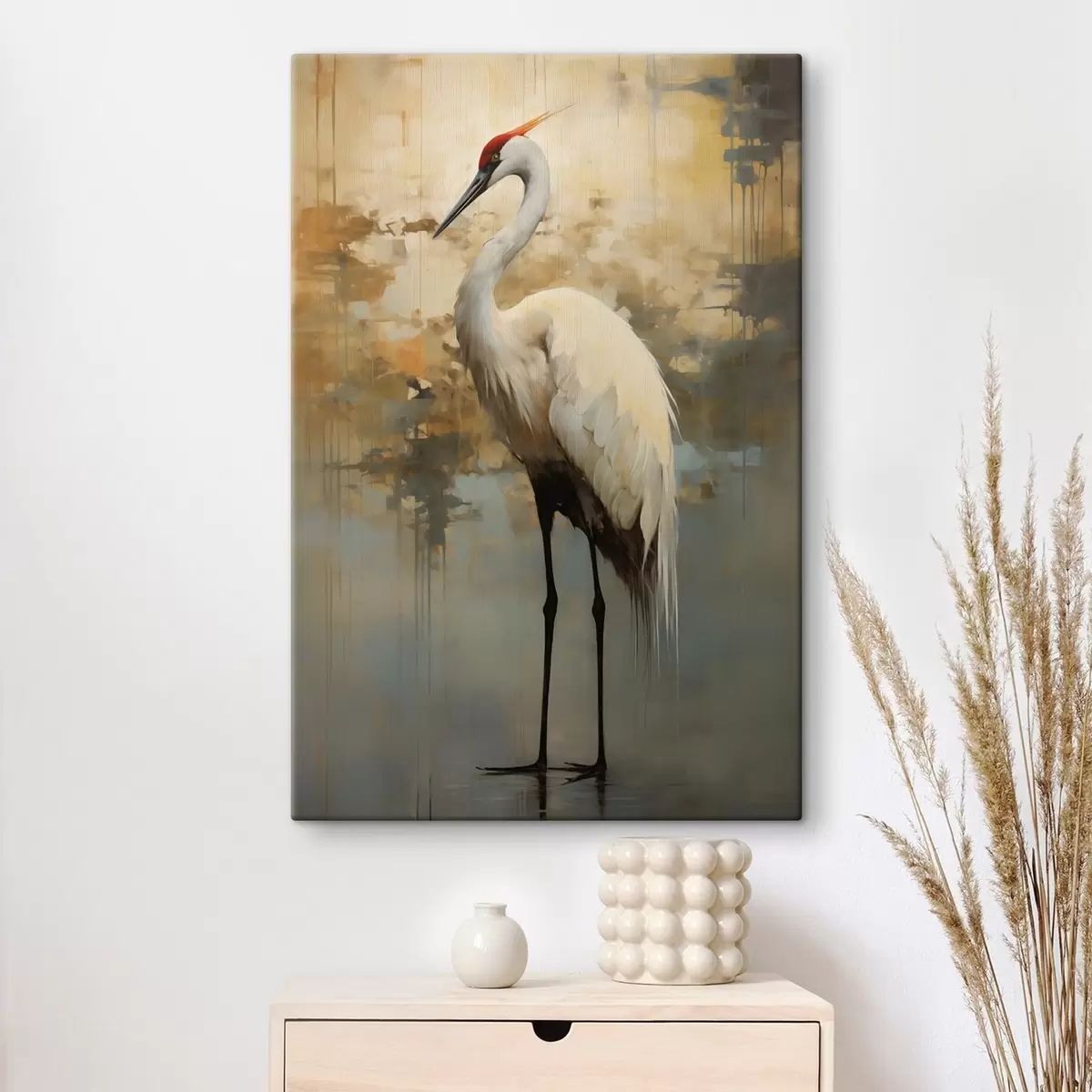 Gemälde Weißer Reiher vor einem Hintergrund aus gedämpften Gelb-, Braun- und Blautönen, der an eine neblige, abstrakte Landschaft erinnert Art. s45192