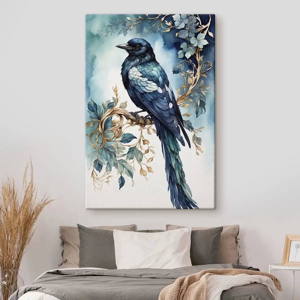 Gemälde Blauer Vogel auf einem Zweig mit Blättern im Aquarellstil Art. s45483