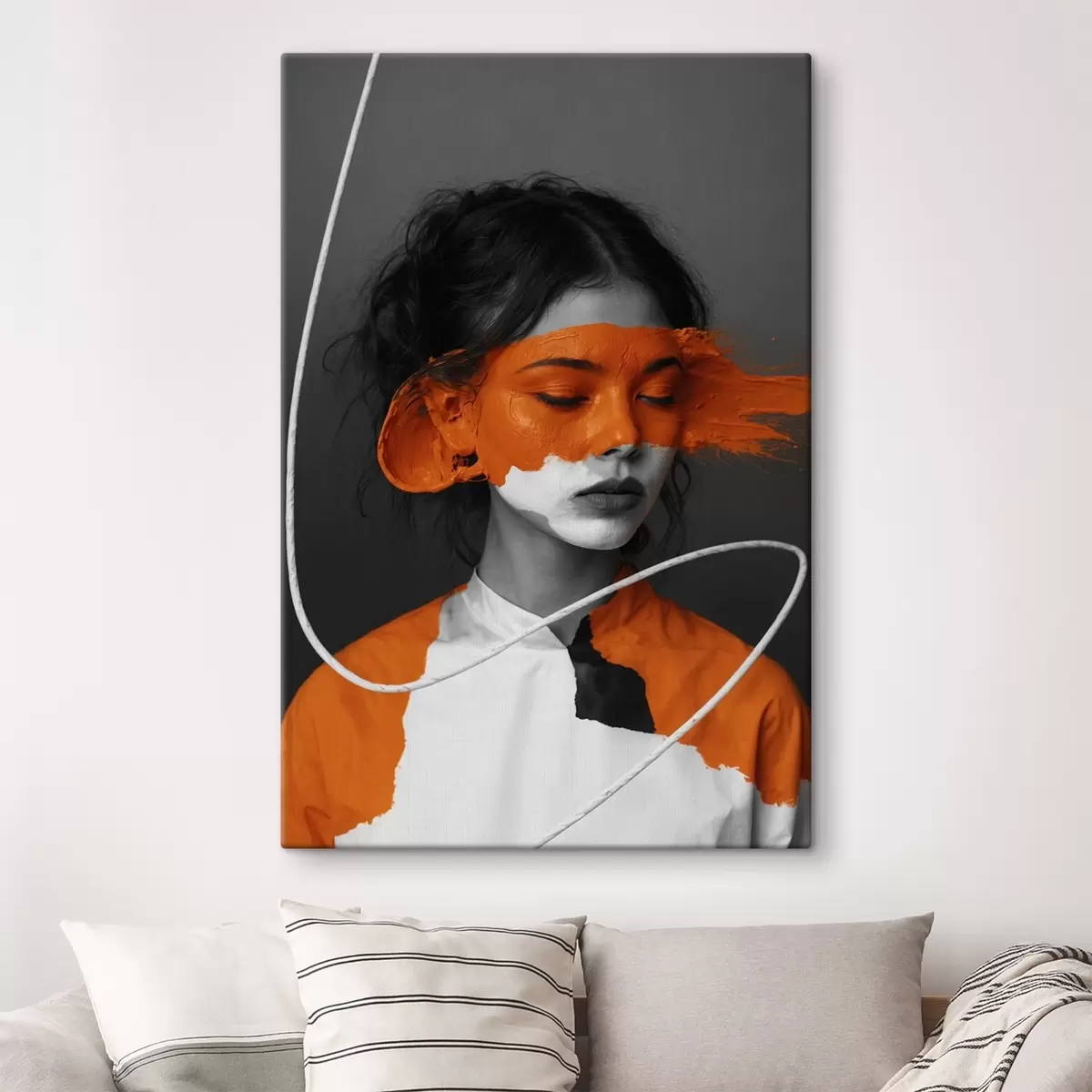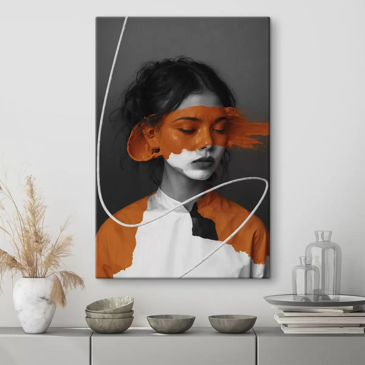 Gemälde Porträt eines Mädchens mit einem abstrakten orangefarbenen Bild Art. s45495