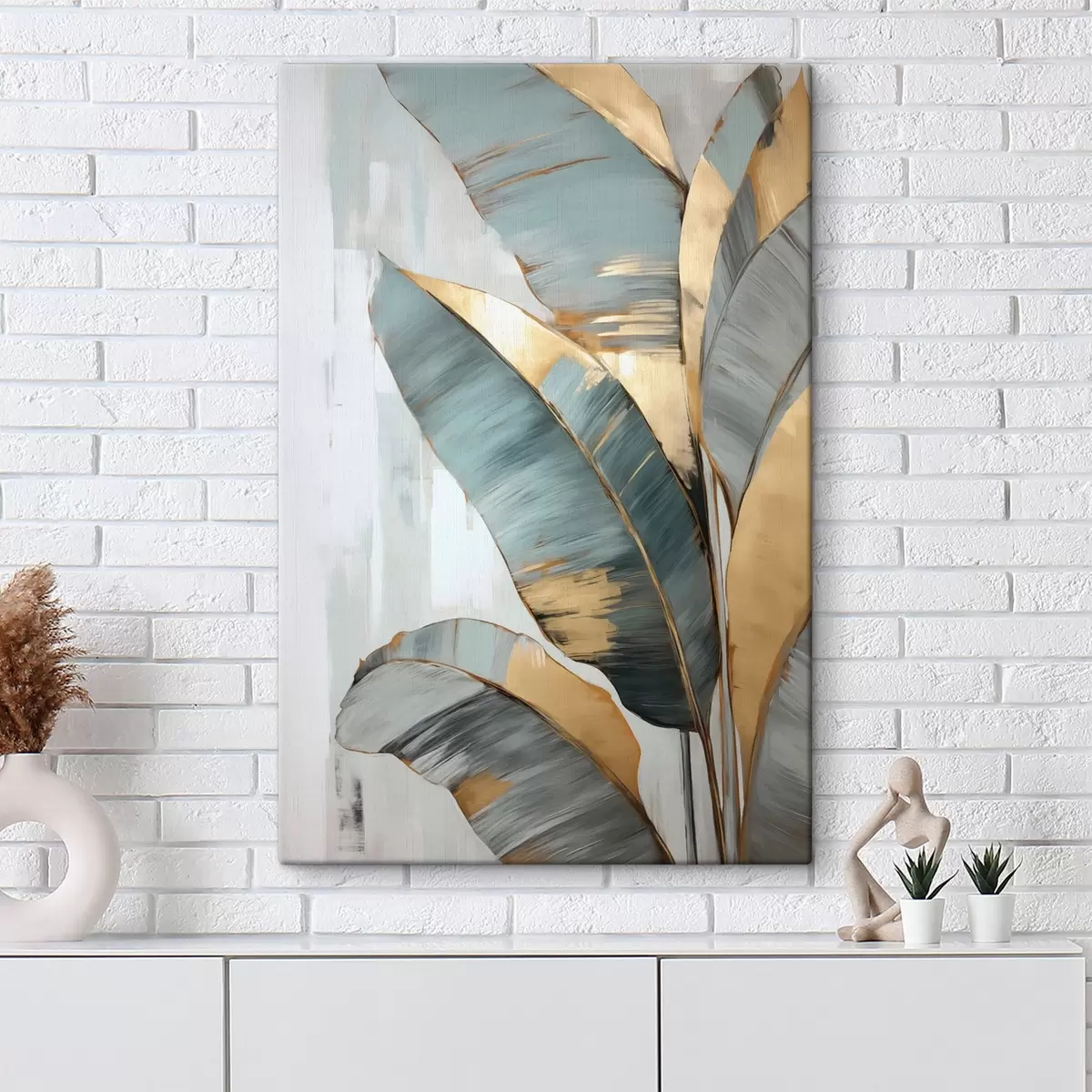 Gemälde Eine Reihe von gedämpften blauen, grauen und gelben Bananenblättern mit sichtbaren Pinselstrichen vor einem weißen abstrakten Hintergrund Art. s45551