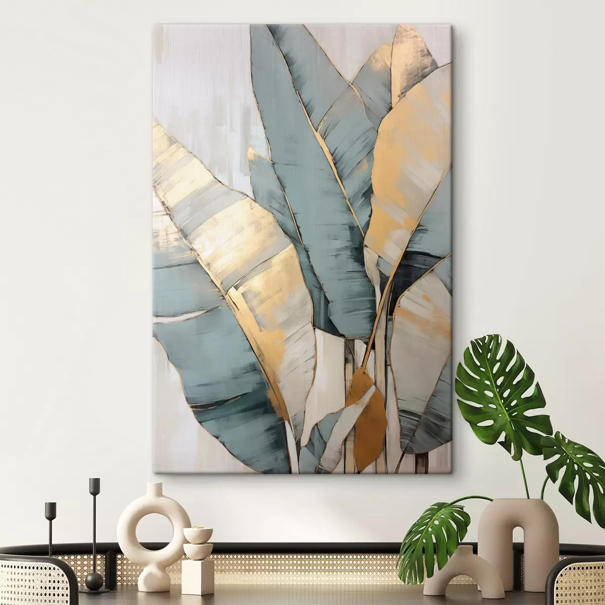 Gemälde Gedämpfte blaue, graue und gelbe Bananenblätter mit sichtbaren Pinselstrichen vor einem weißen abstrakten Hintergrund Art. s45552