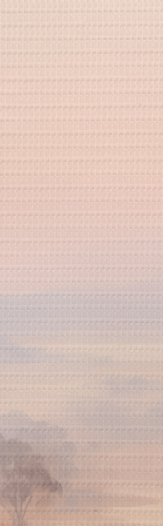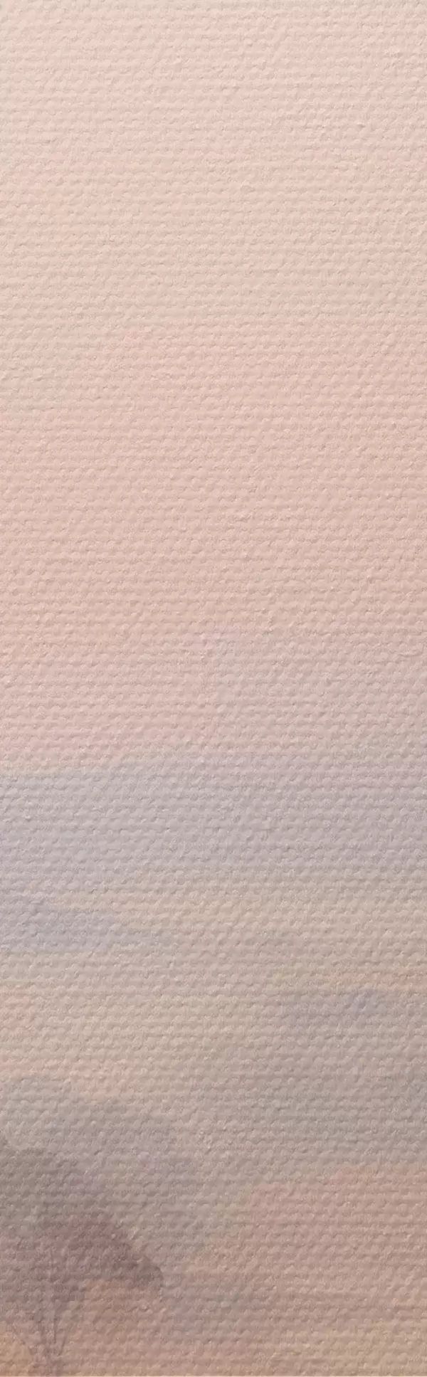 Fototapete Eine Landschaft mit Sträuchern und Bäumen in Pastelltönen von Rosa, Orange und Braun, mit Bergen im Hintergrund s45554
