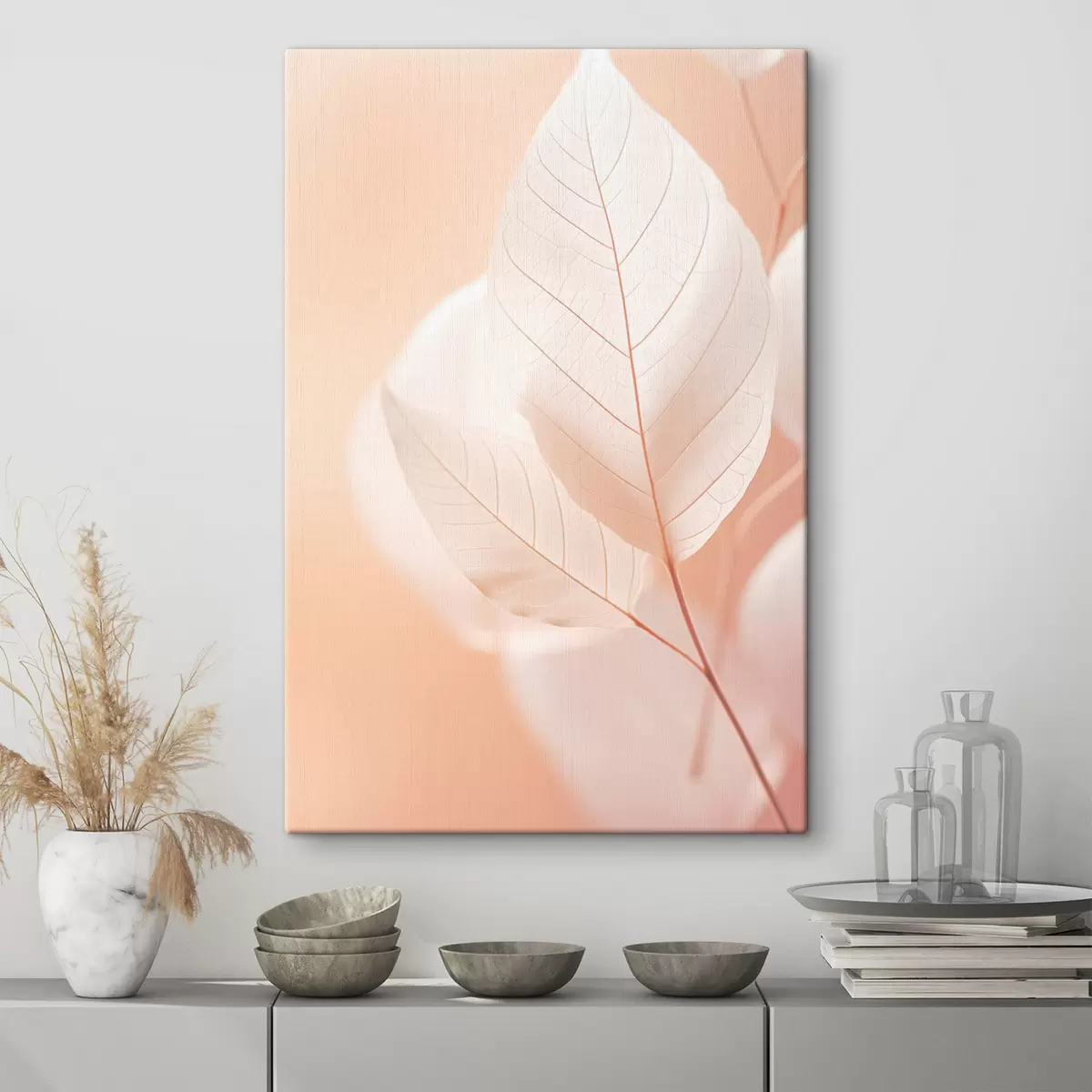 Gemälde Zarte, durchscheinende Blätter mit verschlungenen Adermustern, sanfter pfirsichfarbener Hintergrund, minimalistische botanische Komposition Art. s45555