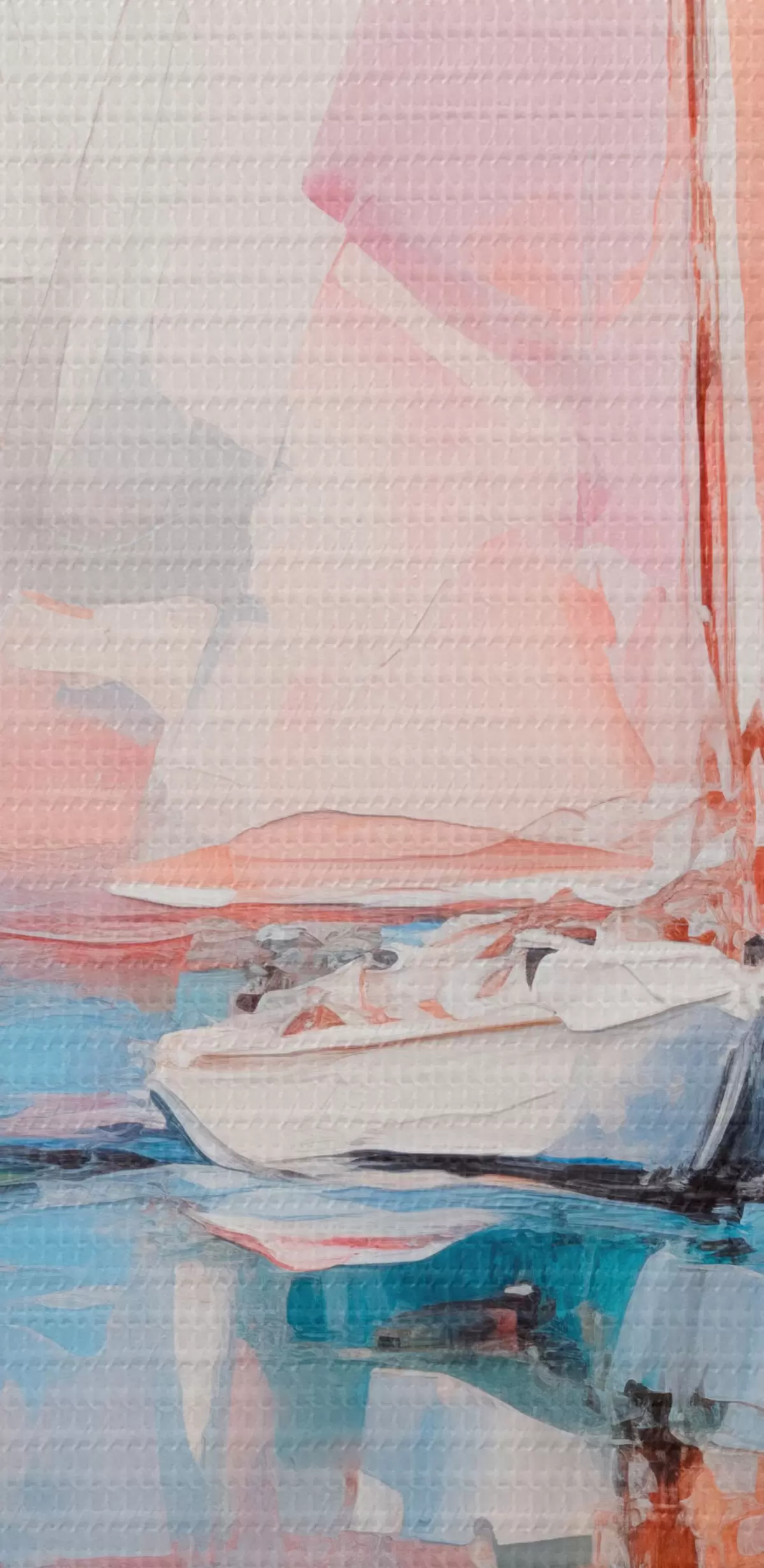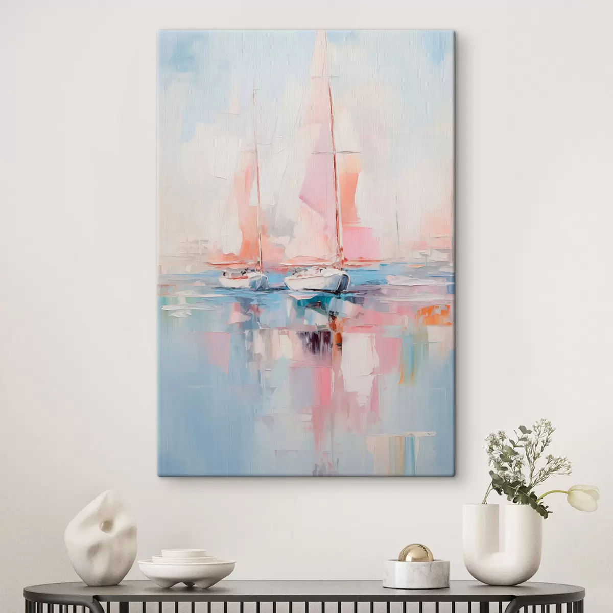 Gemälde Segelboote mit rosafarbenen Segeln, die auf einer ruhigen See treiben, Spiegelungen der Boote im Wasser, sanfte Pastellfarben Art. s45557
