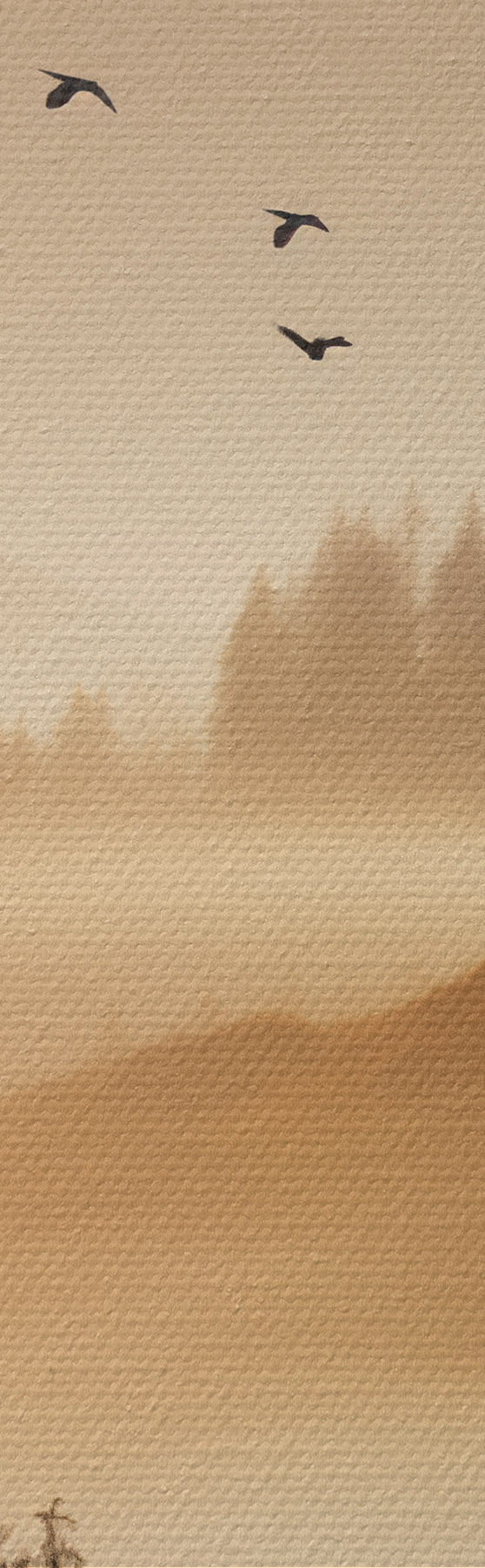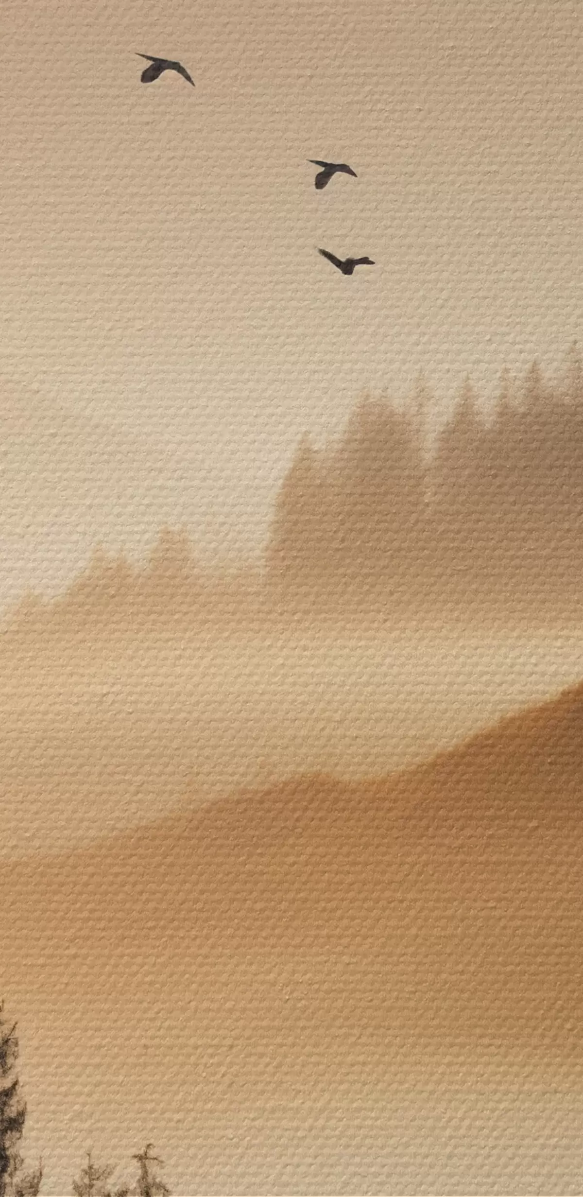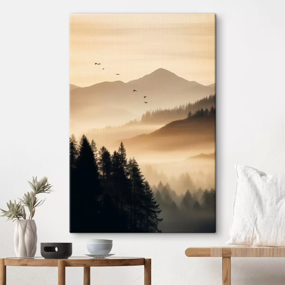 Gemälde Eine Berglandschaft mit einem Wald und Vögeln fliegen in den Himmel, alle in einer dicken Schicht von Nebel während des Sonnenaufgangs bedeckt Art. s45563