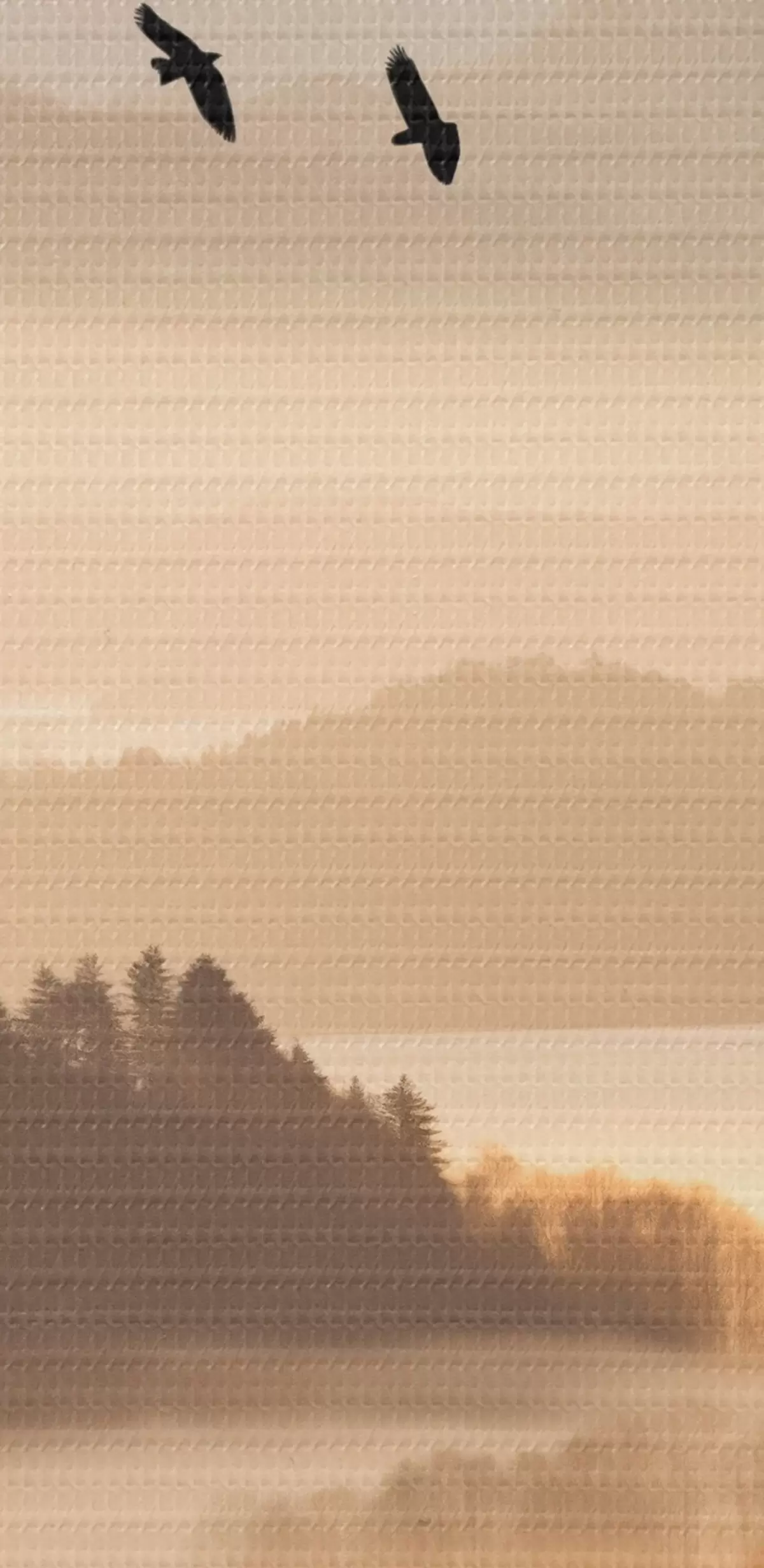 Fototapete Eine Berglandschaft mit einem Wald und Vögeln fliegen in den Himmel, alle in einer dicken Schicht von Nebel während des Sonnenaufgangs bedeckt s45564