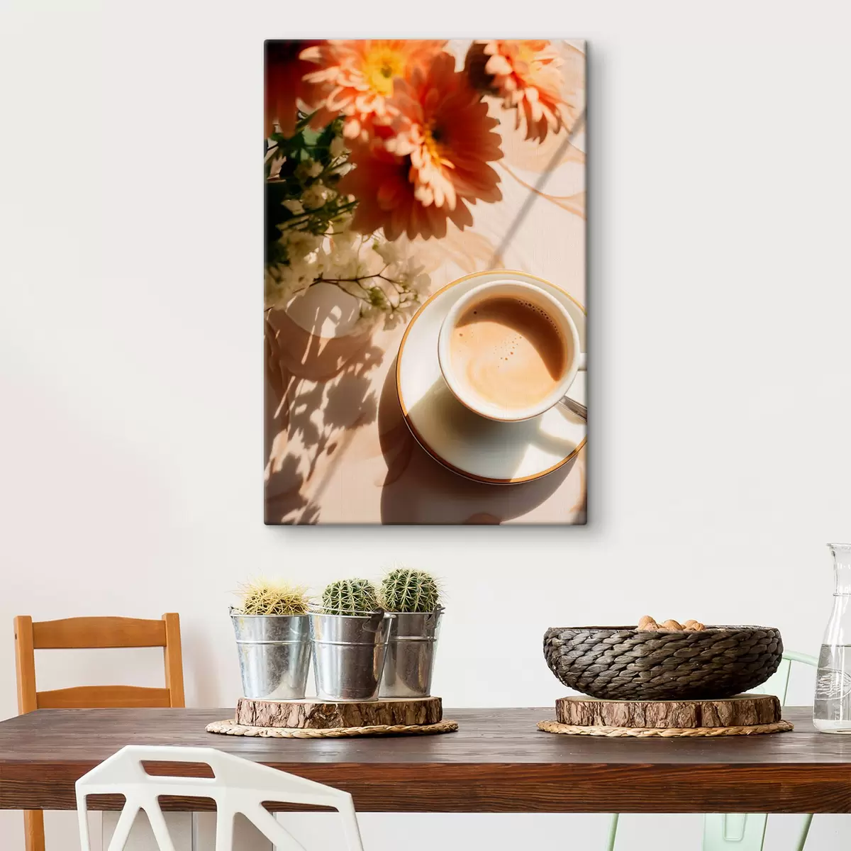 Gemälde Eine Tasse Kaffee mit Schaum auf einem weißen Teller, einige Blumen im Hintergrund, mit Sonnenlicht Art. s45570