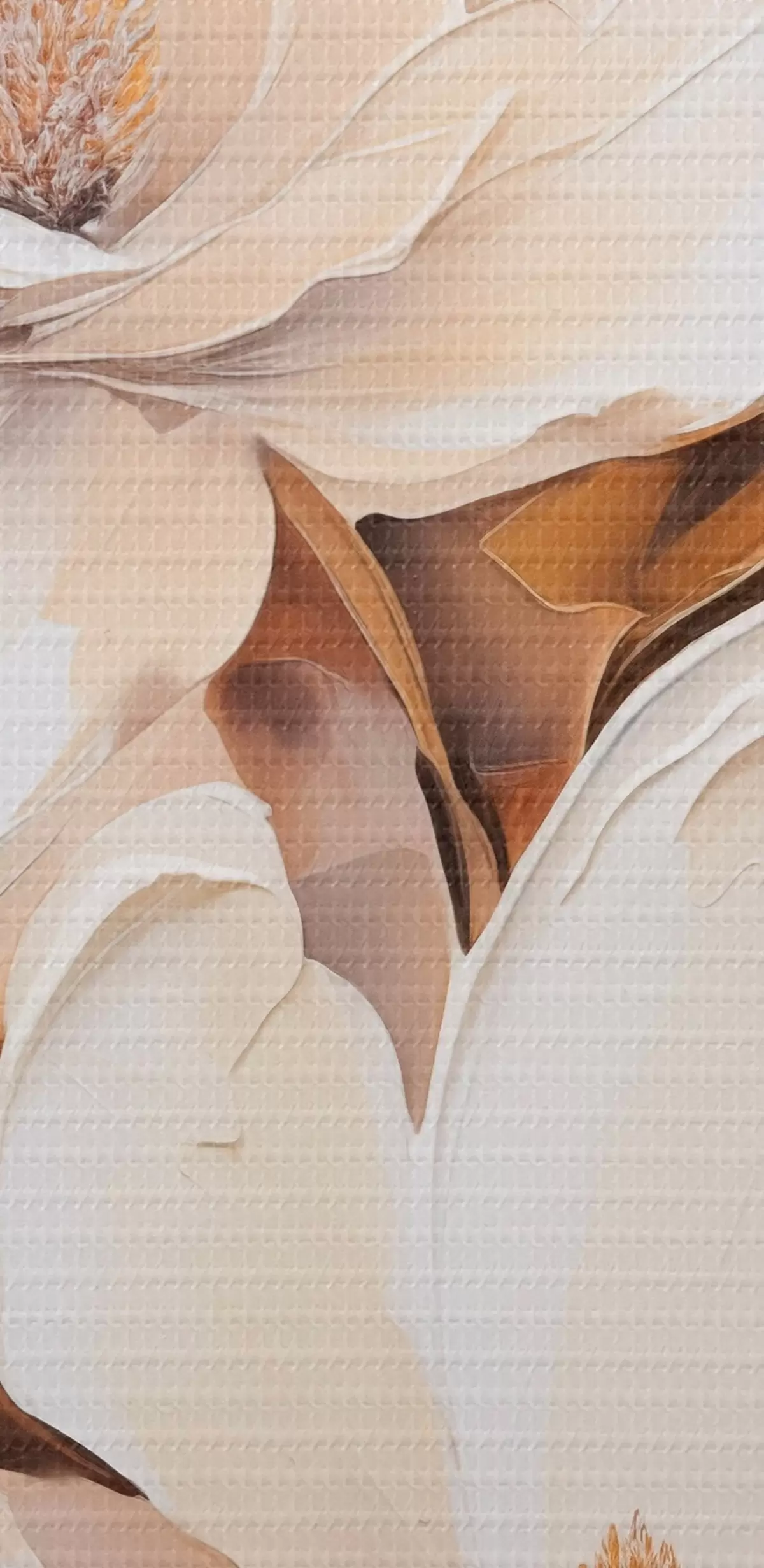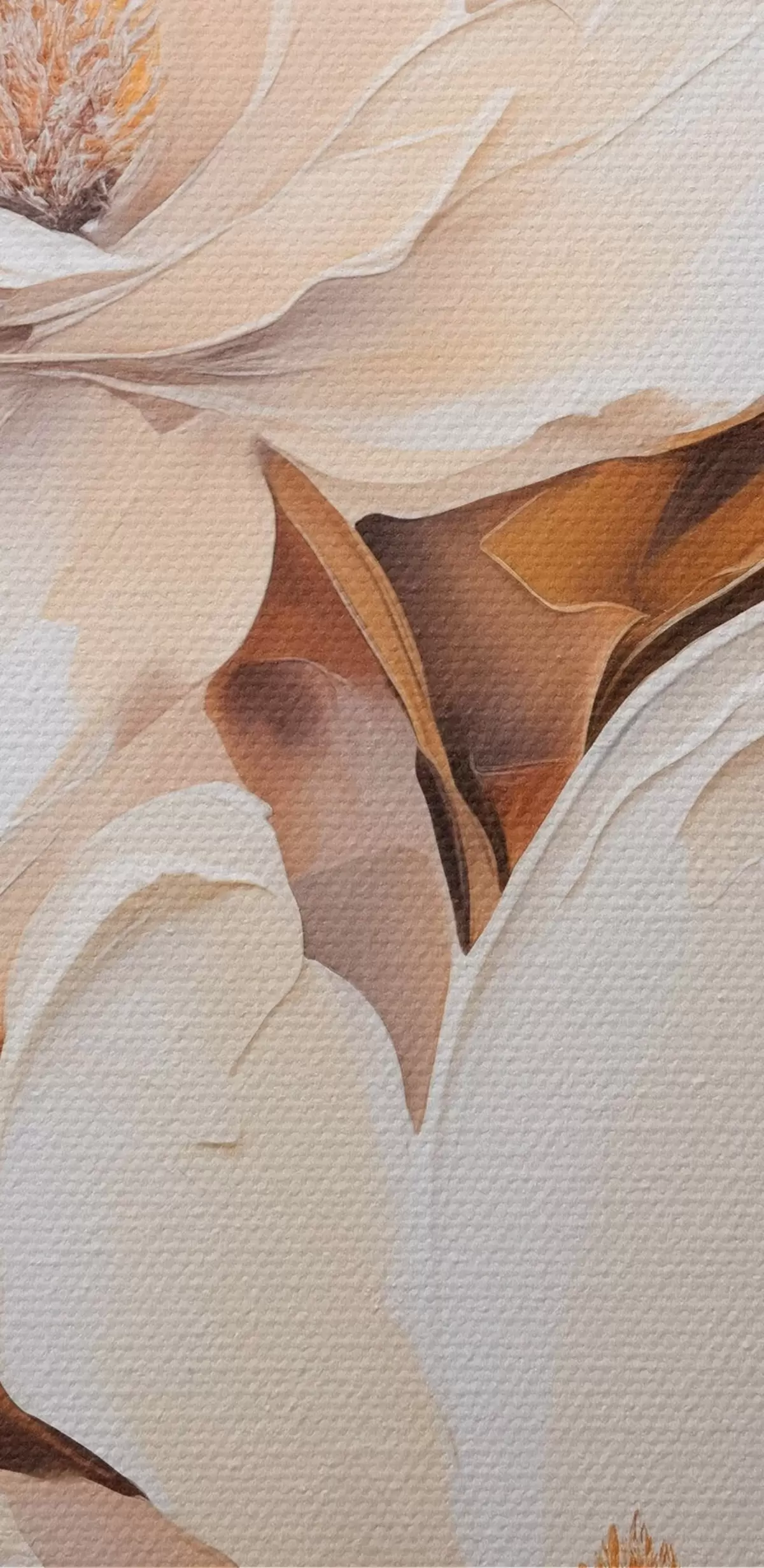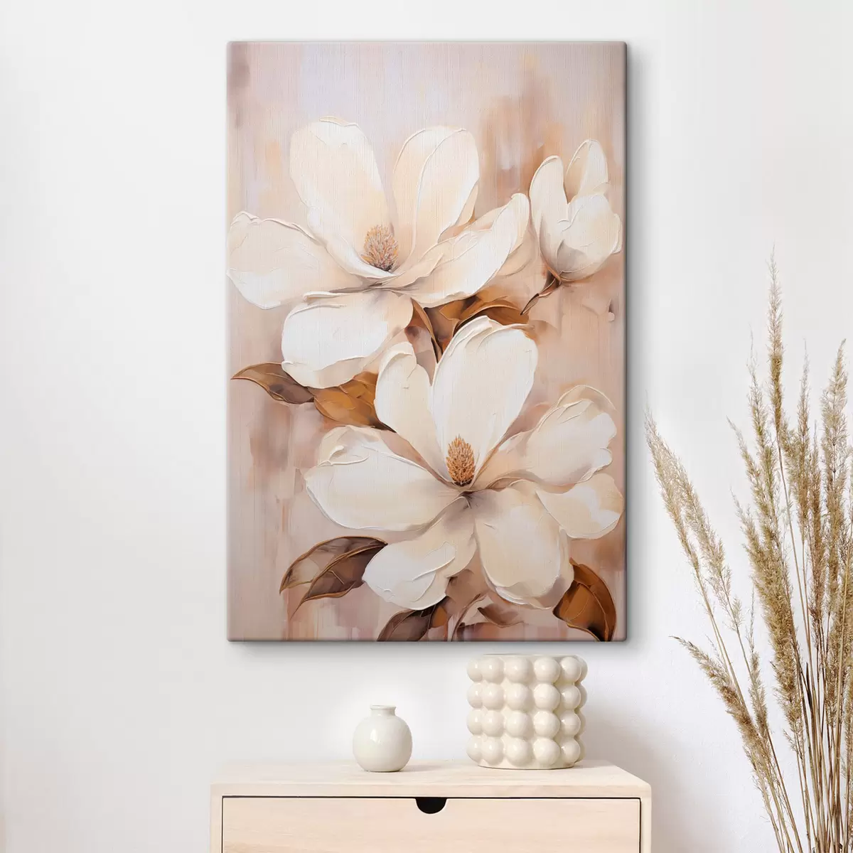 Gemälde Weiße Magnolienblüten vor einem weichen, unscharfen Hintergrund aus Beige- und Brauntönen, Malstil Art. s45572