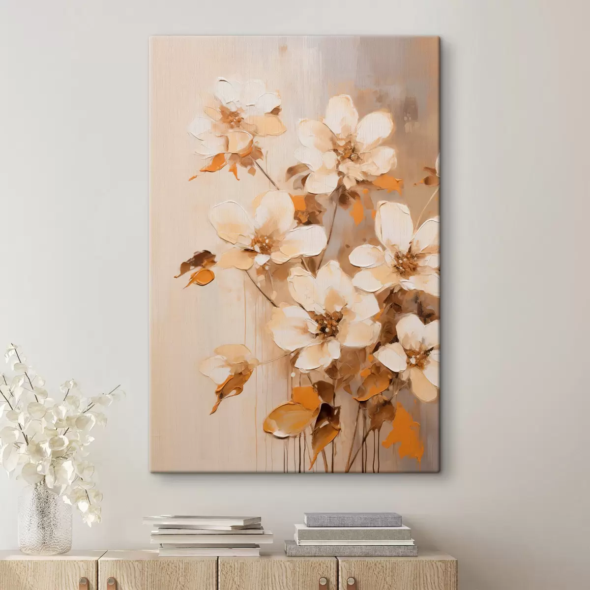 Gemälde Weiße Blumen mit orangefarbenen Blättern, zarte Pinselstriche, Blumenarrangement, botanische Kunst Art. s45574