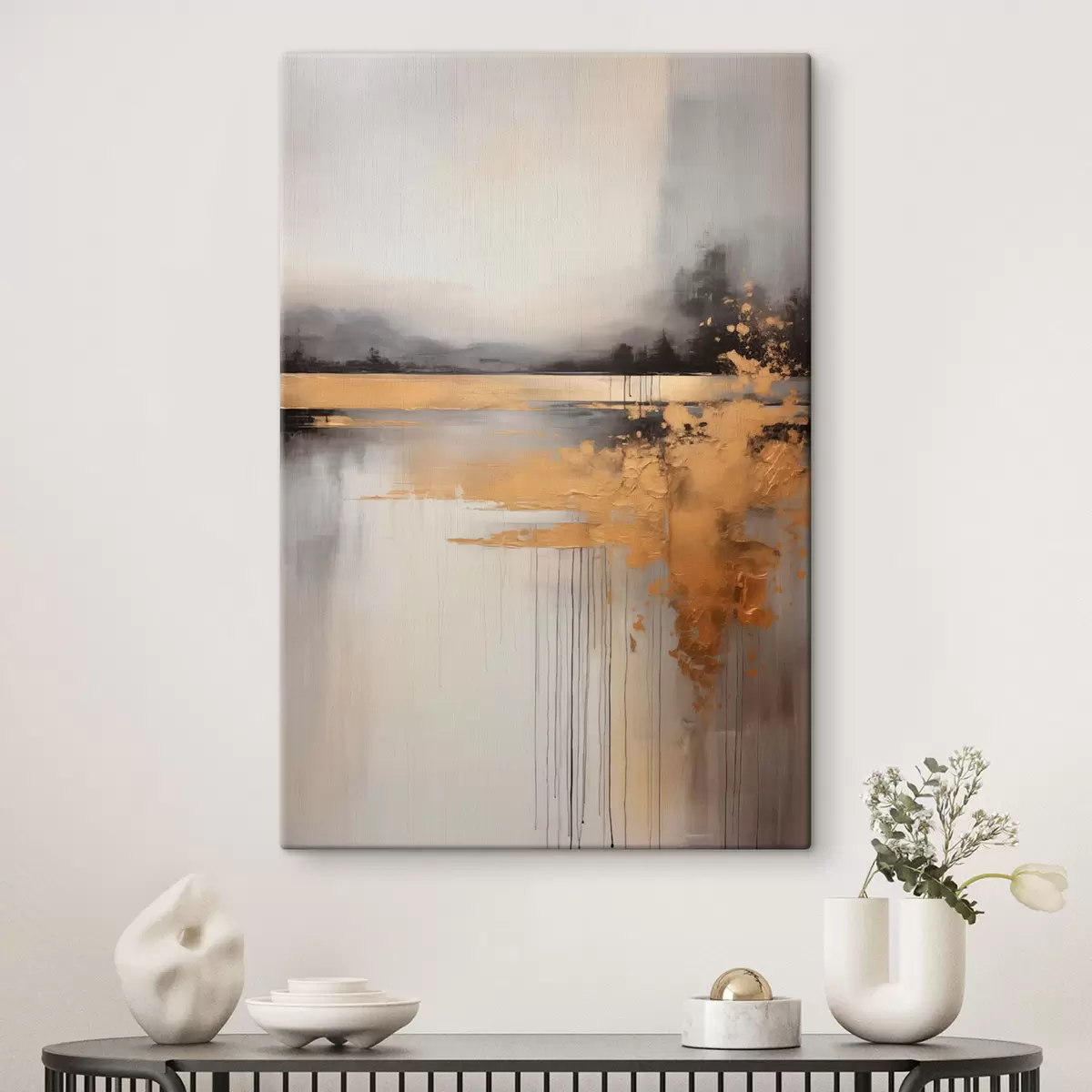 Gemälde Abstrakte, strukturierte Landschaft mit einem Fluss und dunklen Bäumen im Hintergrund, der Himmel ist bewölkt Art. s45576