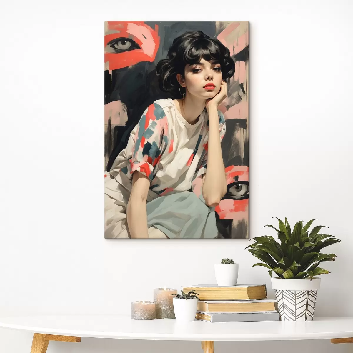 Gemälde Porträt eines Mädchens vor einem Hintergrund mit Augen und abstrakten Strichen Art. s45623