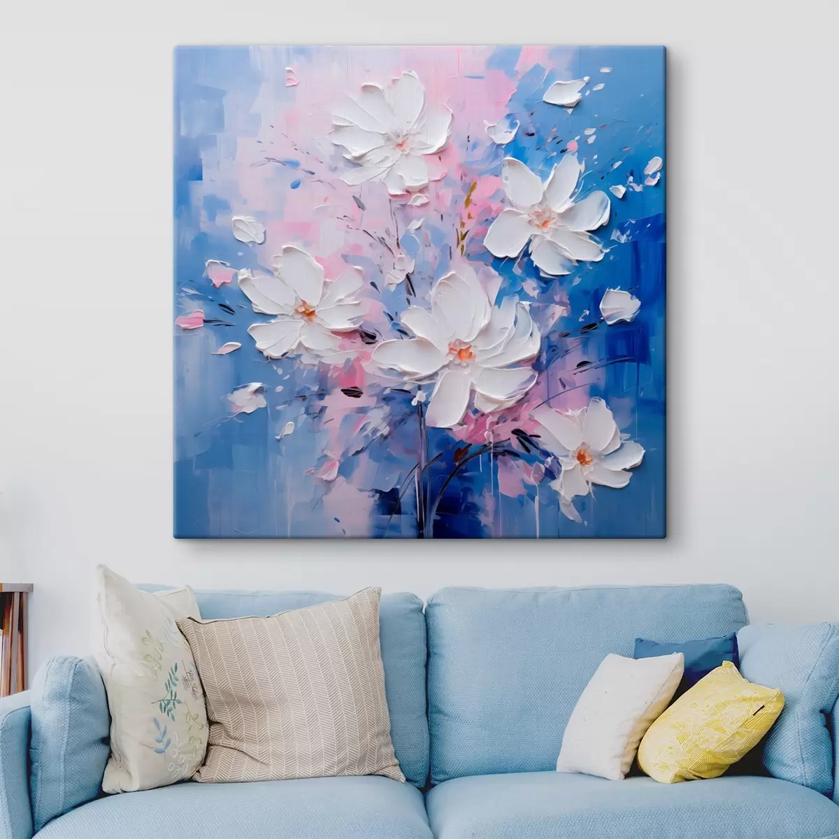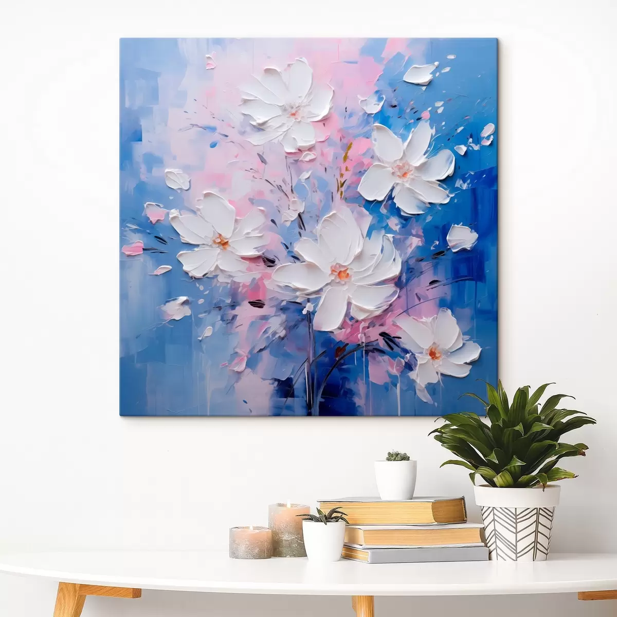 Gemälde Volumetrische Blumen auf blauem Hintergrund im Impasto-Stil Art. s45648