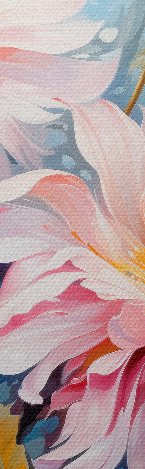 Drei Materialtypen stehen zur Verfügung: Economic Canvas - ein dichtes und haltbares Material für den Digitaldruck, identisch mit Malerleinwand, wasserfeste Oberfläche, realistische Wiedergabe von Details, mittelkörniges Material. Premium Canvas - die Textur ähnelt der einer Malerleinwand (verwobene kleine Fäden). Weiche, detaillierte Wiedergabe des Bildes auf einer matten Oberfläche. Eco-Premium - hochwertiges Gewebe aus 100% Baumwolle. Dank der natürlichen Baumwollfasern ist das Material langlebig und verschleißfest. Hervorragende Farbwiedergabe und Detailtreue.