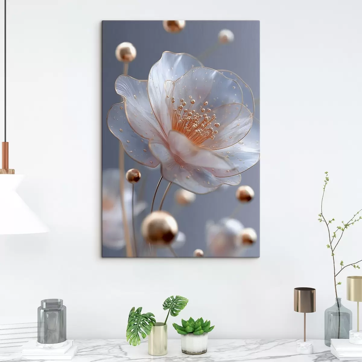 Gemälde Durchscheinende Blume mit kupferfarbenen Staubblättern auf blauem Hintergrund Art. s45880