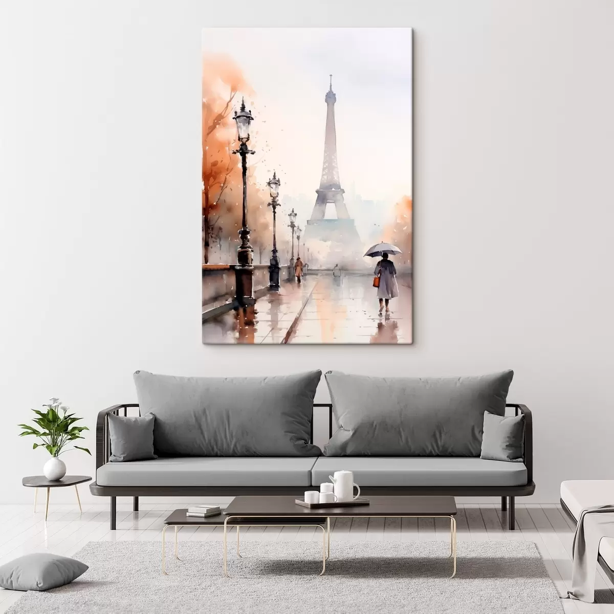 Gemälde Ein regnerischer Tag in Paris mit dem Eiffelturm im Hintergrund und Vintage-Straßenlaternen Art. s45930