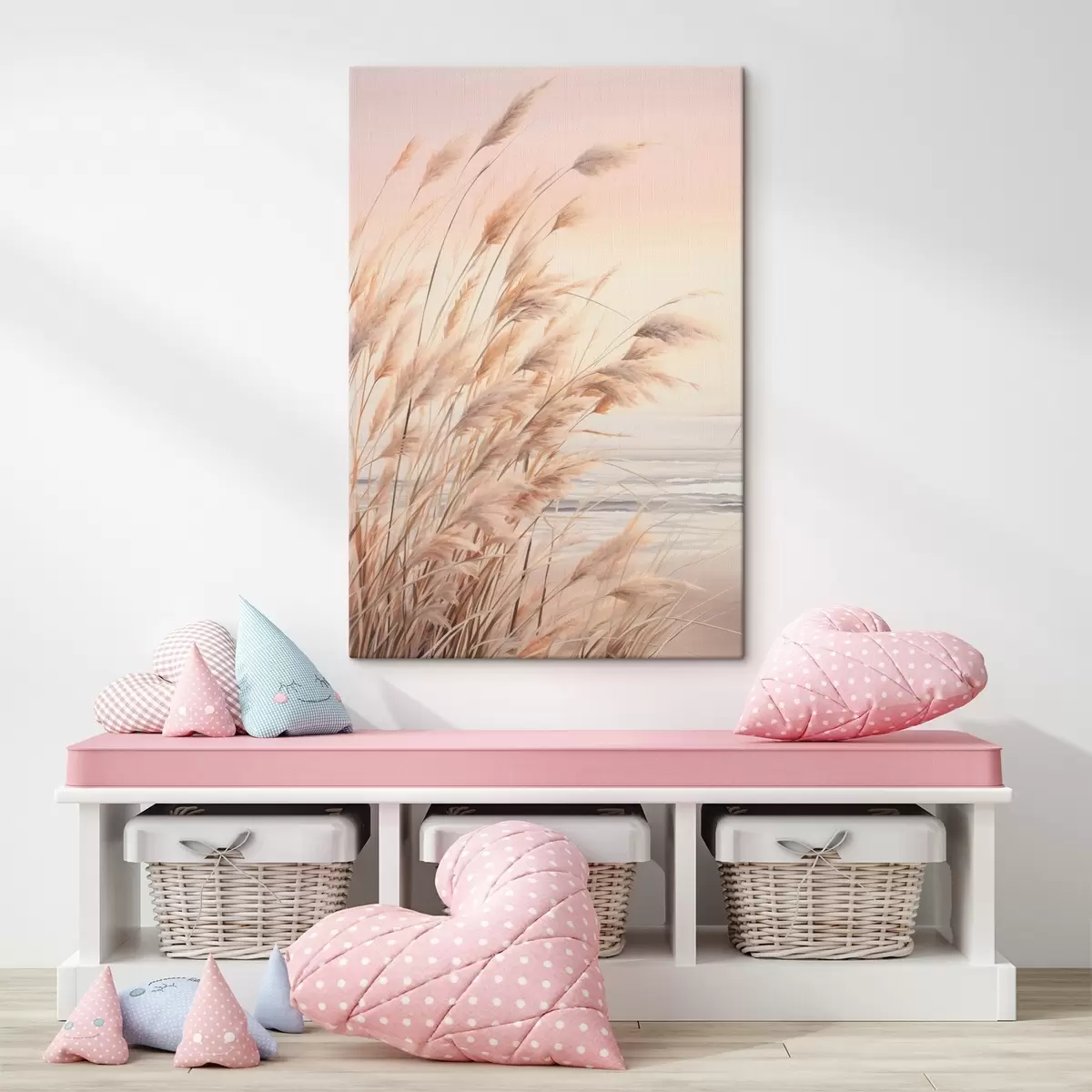 Gemälde Pampasgras mit pastelloranger Farbpalette, hellrosa Himmel, eine ruhige Landschaft Art. s45934