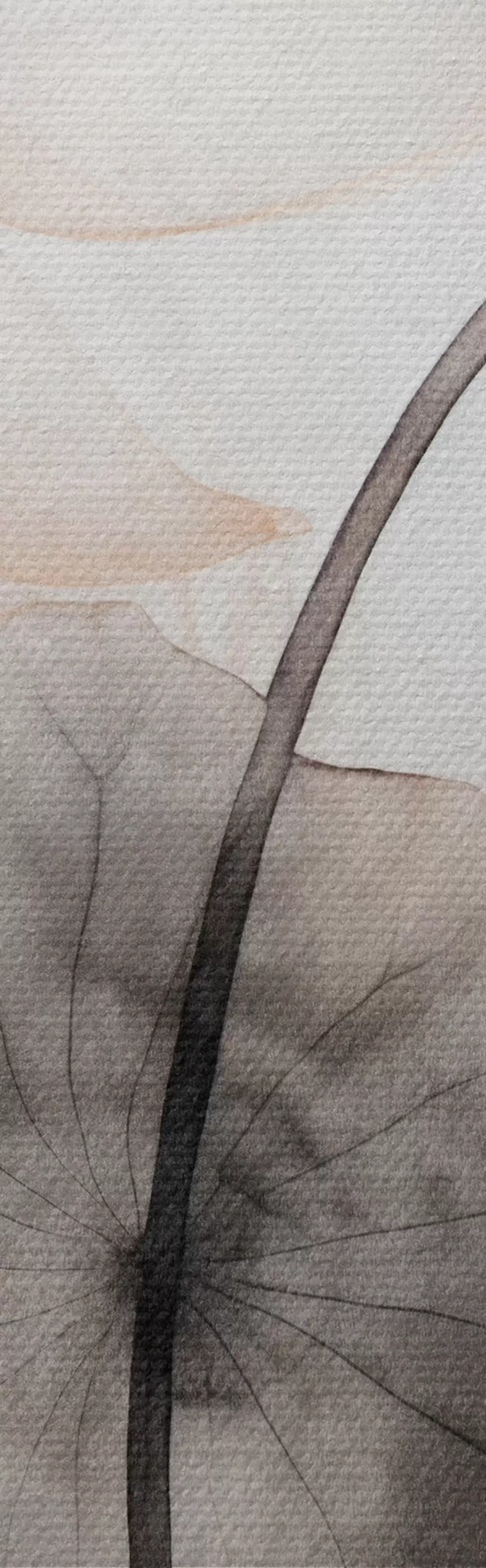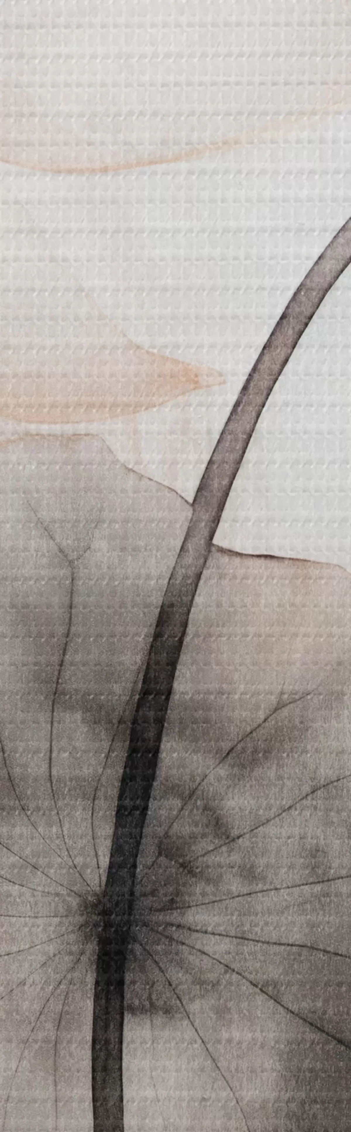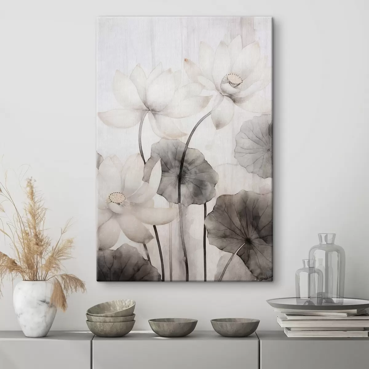 Gemälde Weiße Lotusblumen mit dunkler Blattstruktur, heller Hintergrund, minimalistisches Design Art. s45937