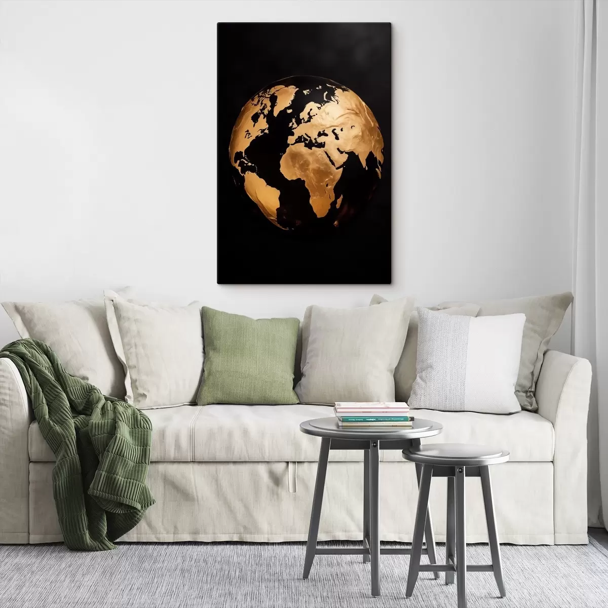 Gemälde Gelber strukturierter abstrakter Erdglobus, Planet auf schwarzem Hintergrund, moderne minimalistische Kunst Art. s45942