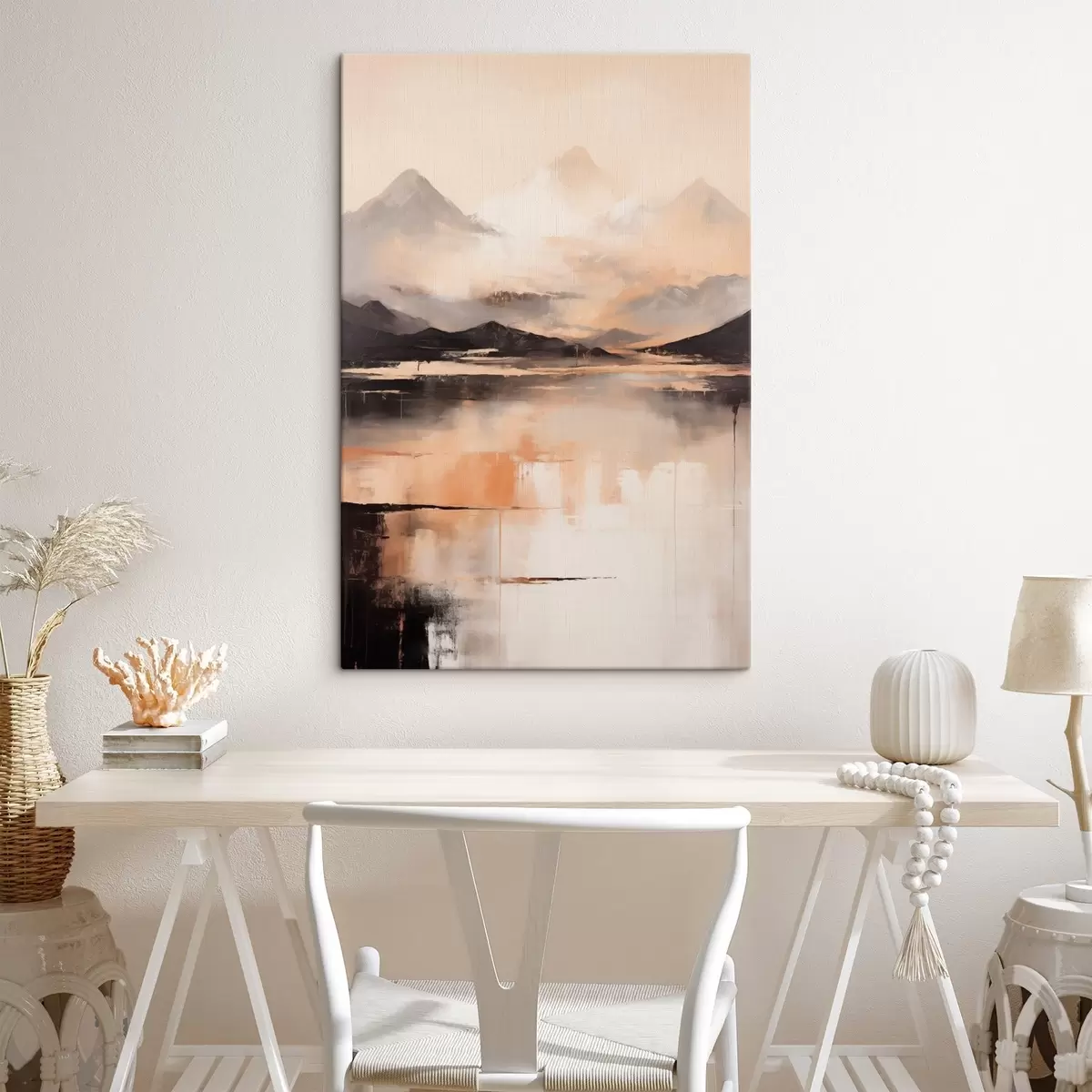 Fototapete Eine Landschaftsmalerei mit Struktur, die Berge und einen See imitiert s45950