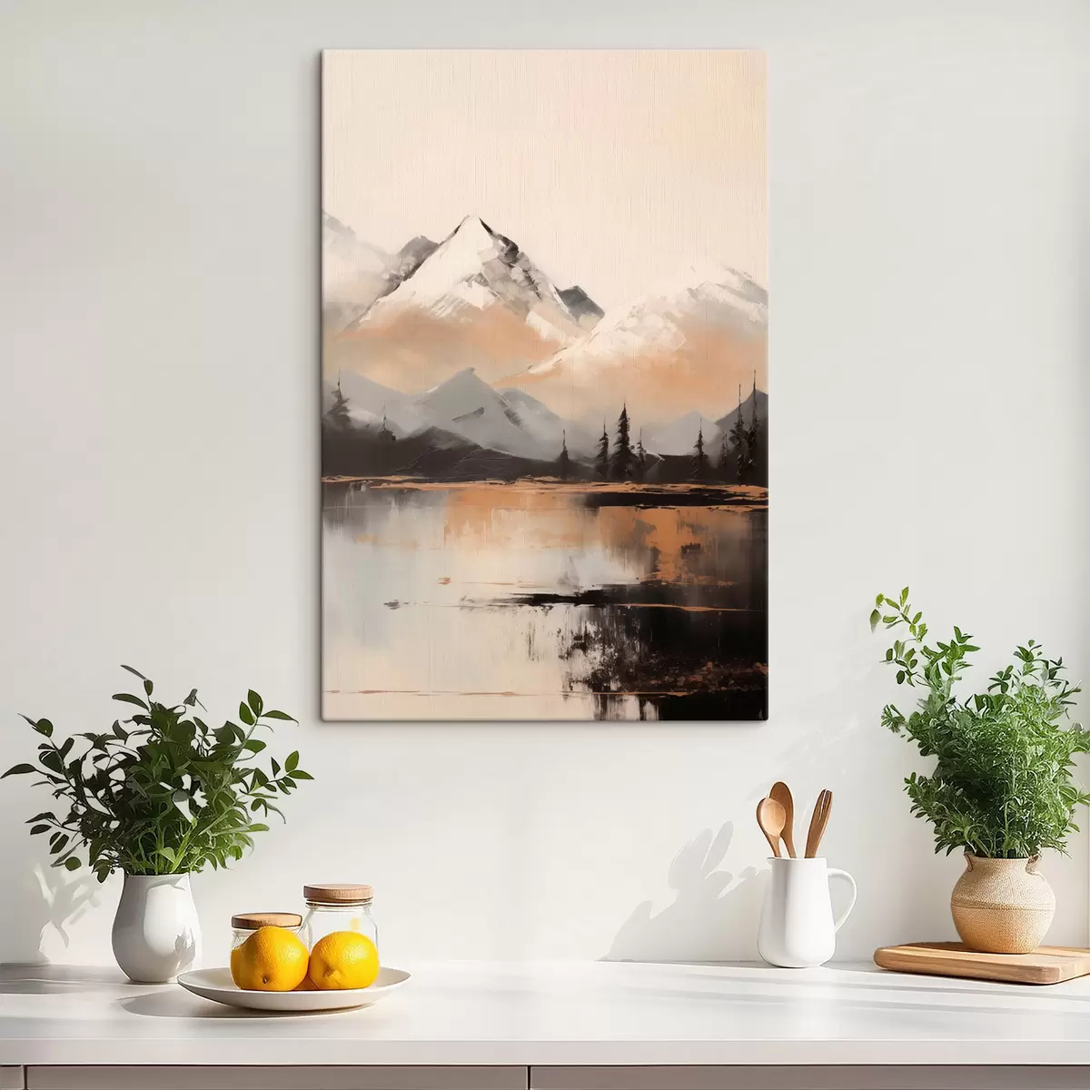 Gemälde Verschneite Berge mit Baumstruktur vor einem See Art. s45951