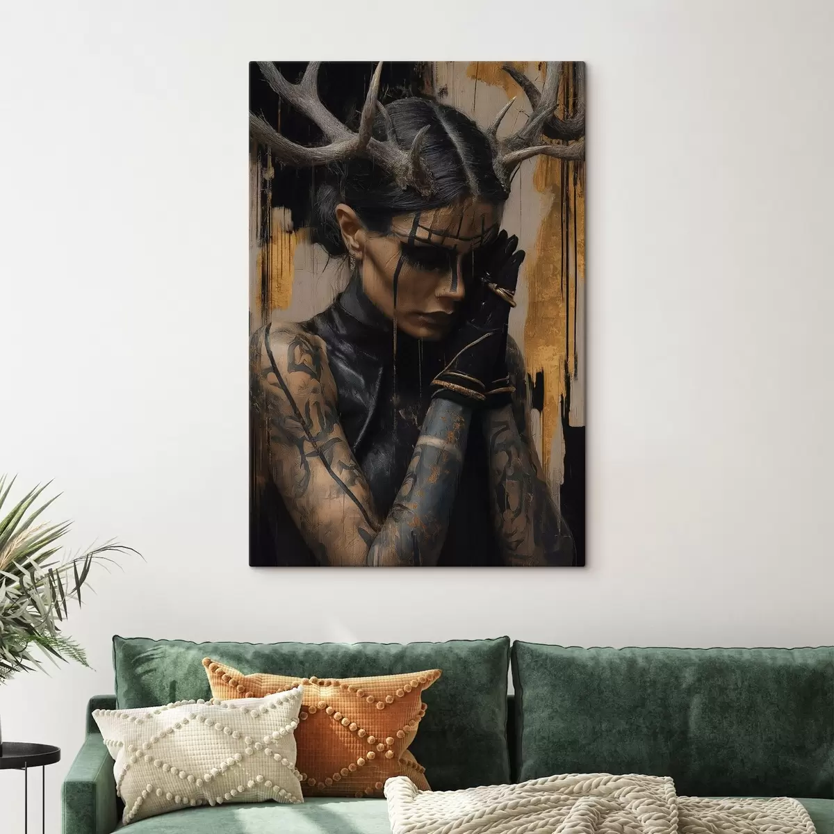 Gemälde Frau mit Hörnern in einem dunklen Look mit schwarzen Gesichtszügen Art. s46144