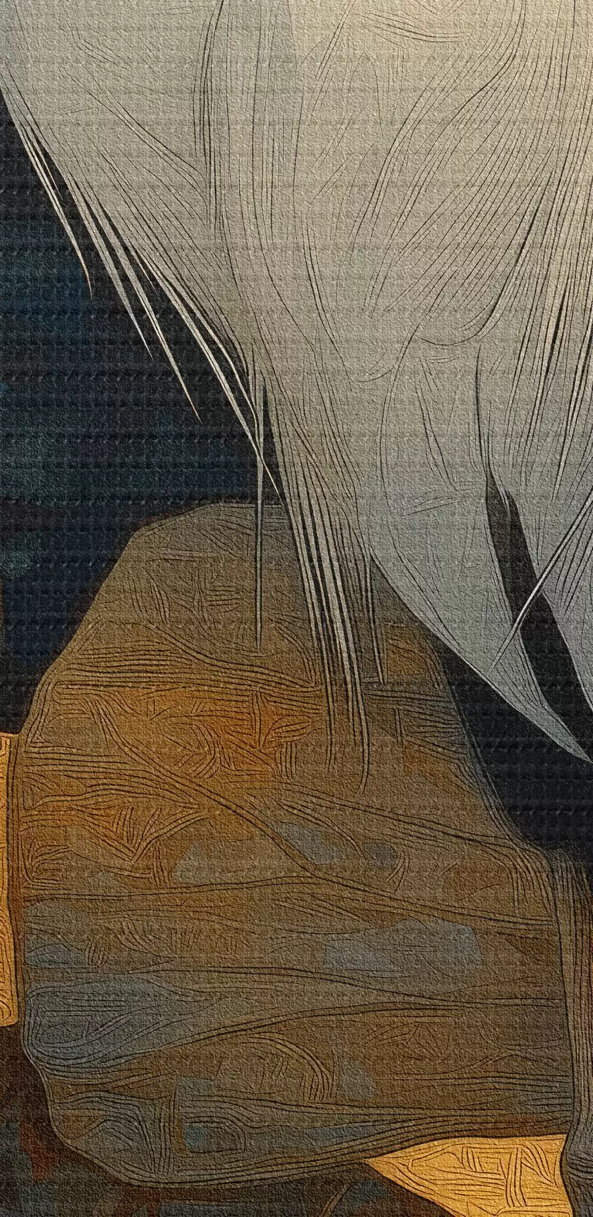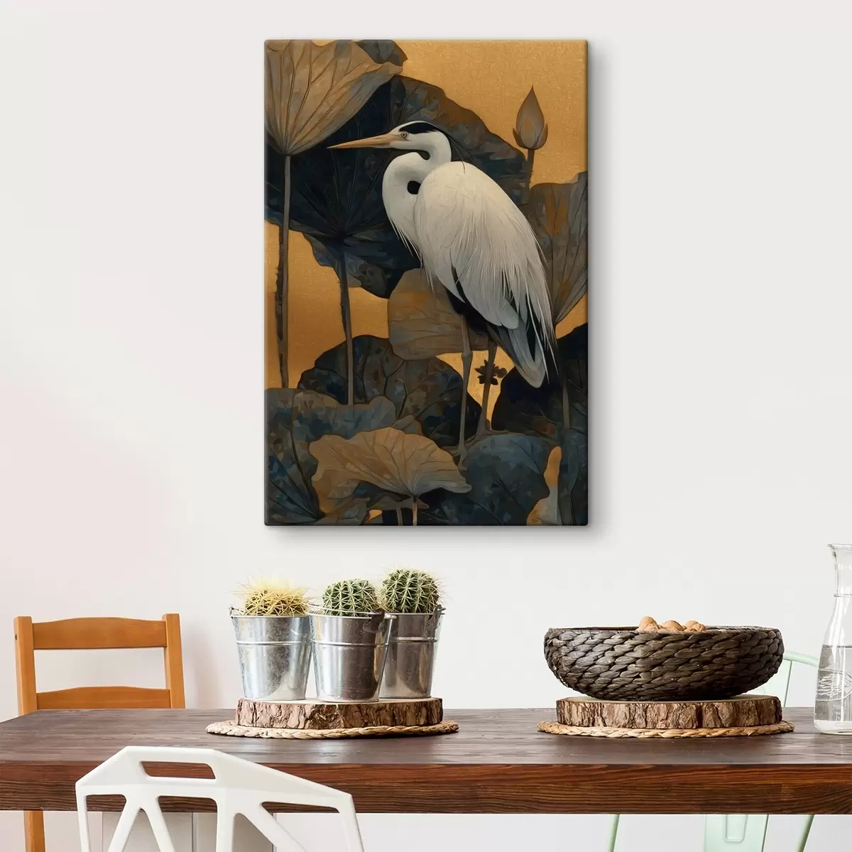 Gemälde Weißer Reiher zwischen großen Blättern auf warmem Hintergrund Art. s46147