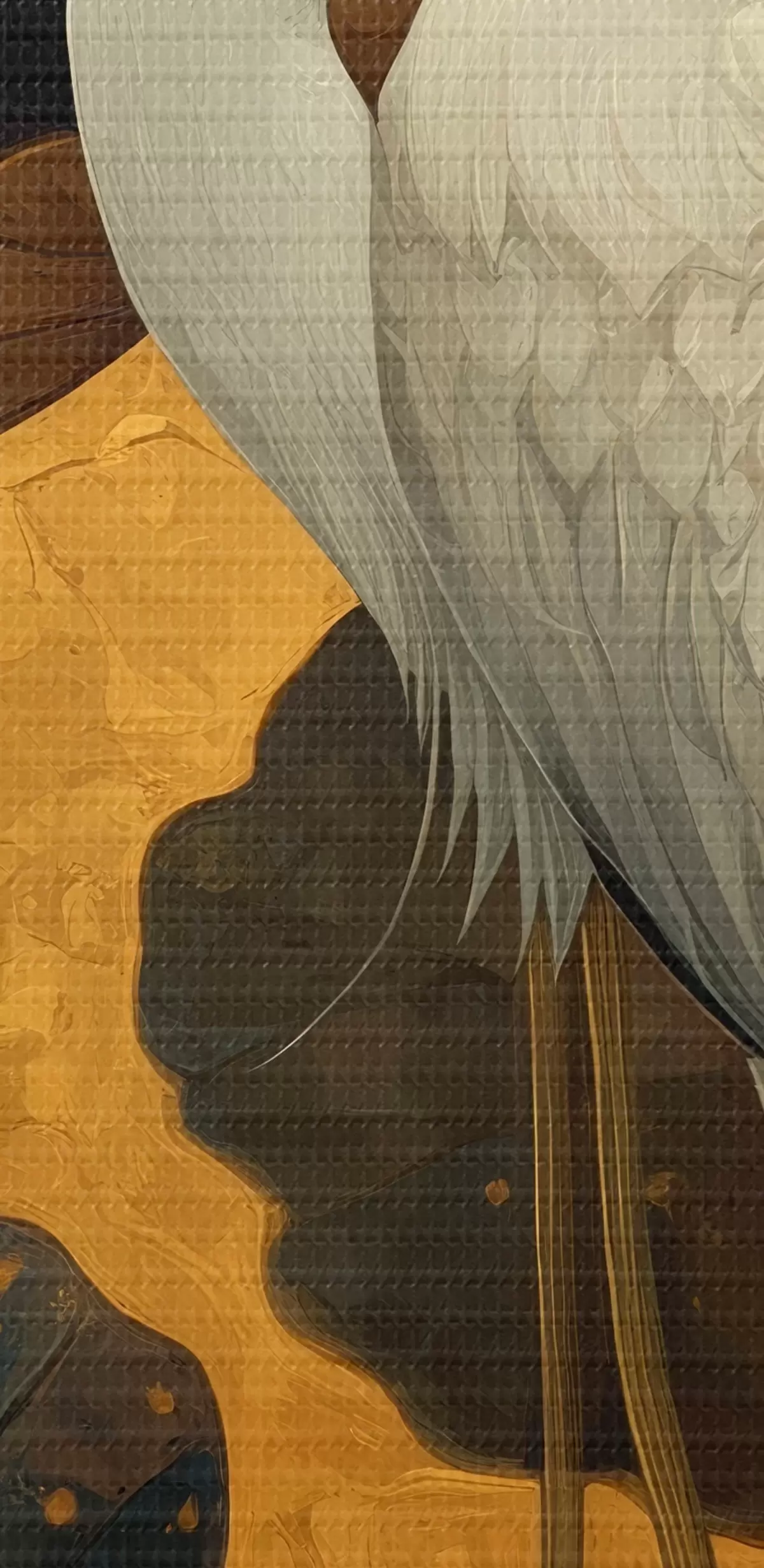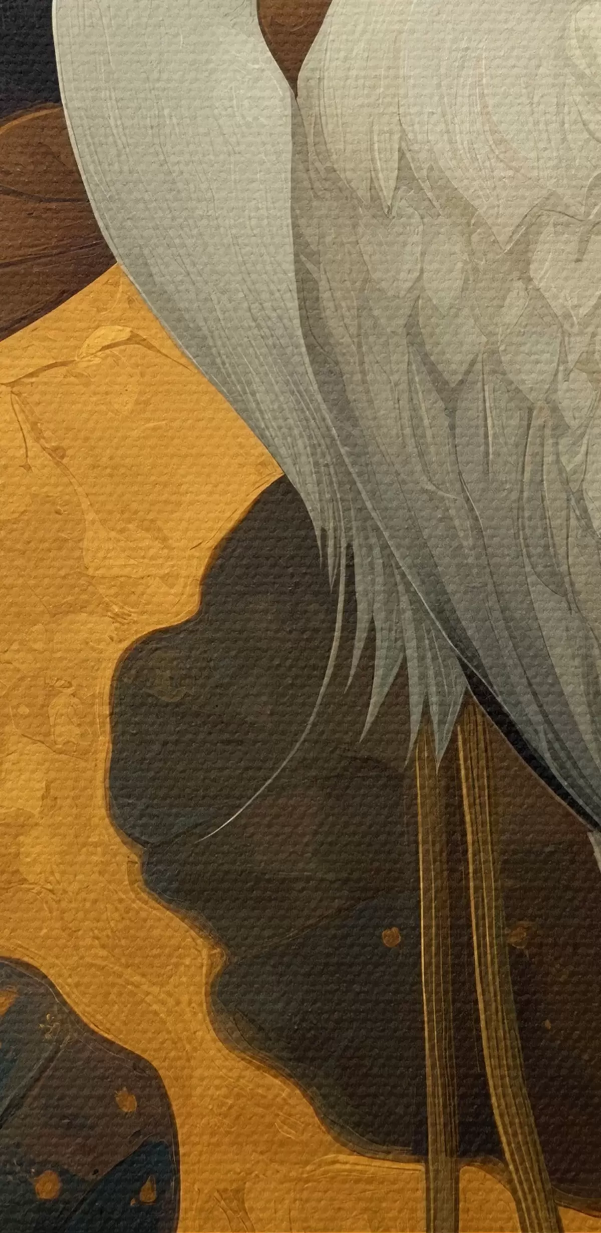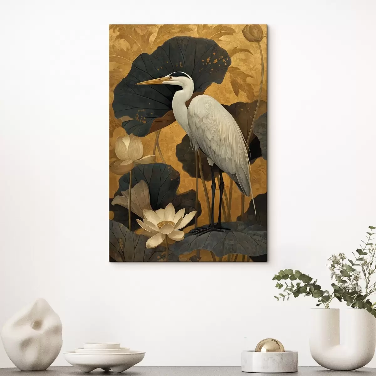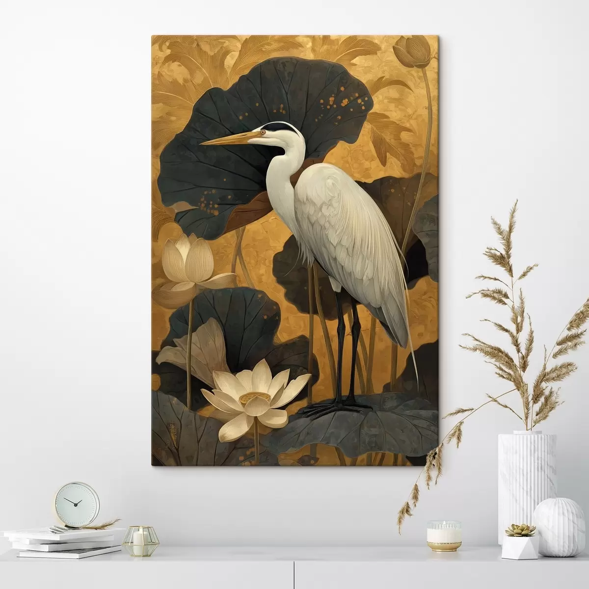 Gemälde Reiher zwischen Lotusblumen auf warmem Hintergrund Art. s46148