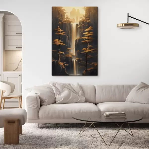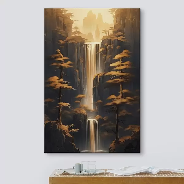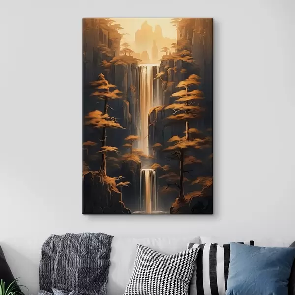 Gemälde Hohe Klippen mit einem Wasserfall und Kiefern im Abendlicht Art. s46151