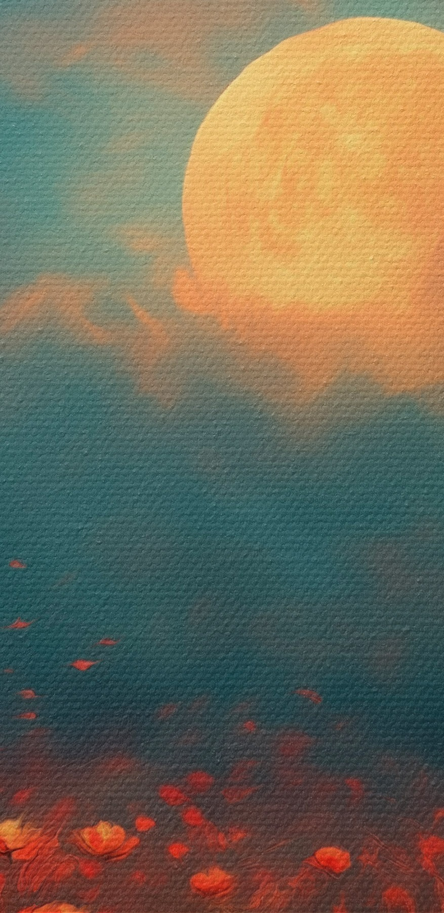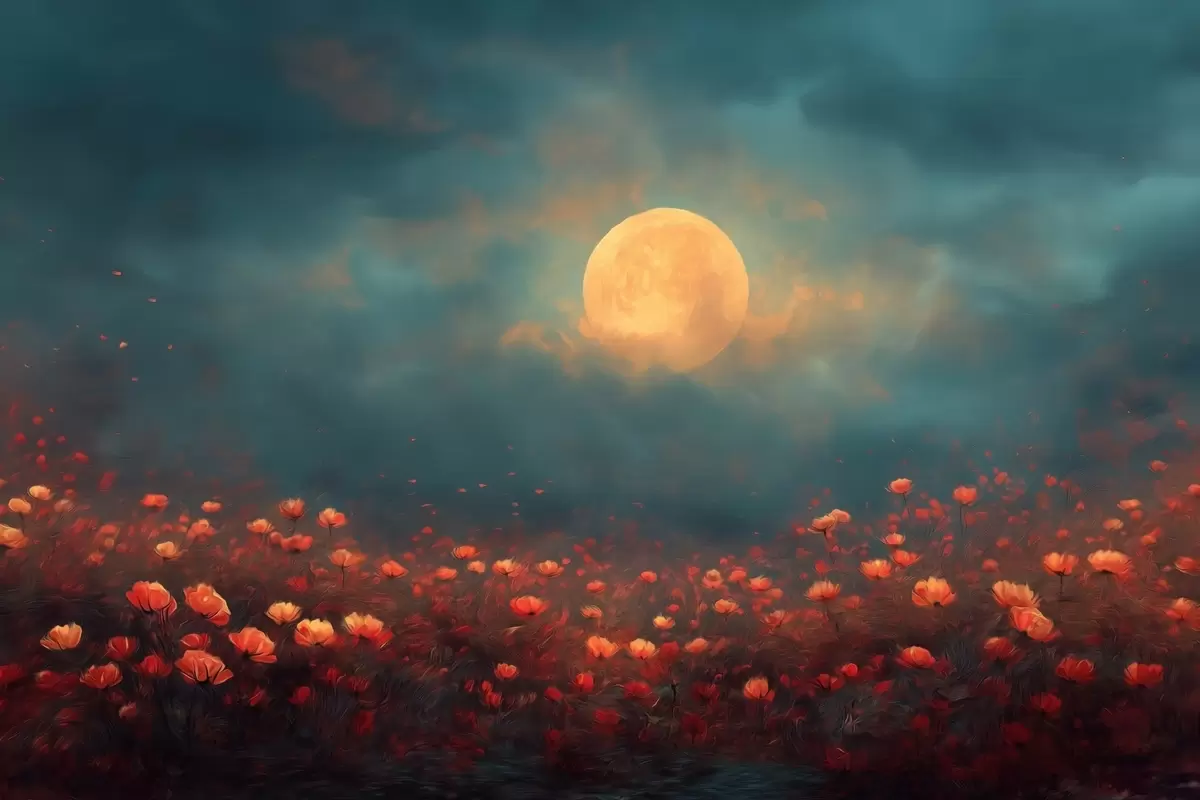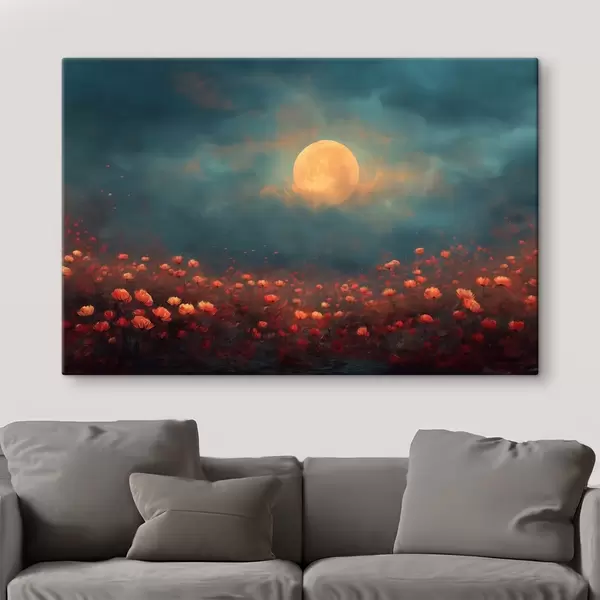 Gemälde Mond über einem Feld voller roter Blumen an einem nebligen Abendhimmel Art. s46167