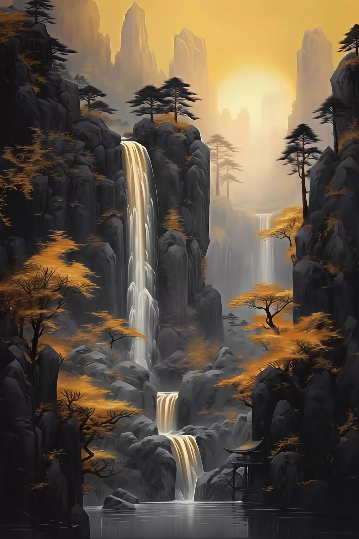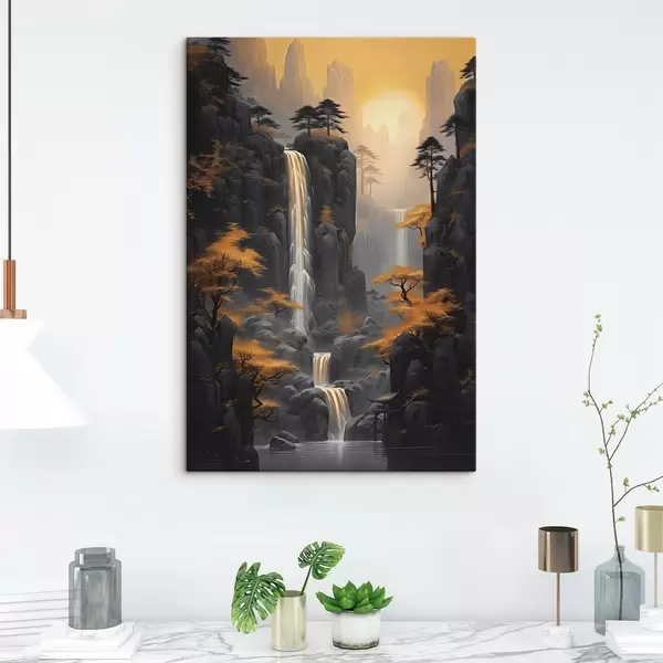 Gemälde Felsige Landschaft mit einem Wasserfall in warmen Sonnenuntergangsfarben Art. s46177