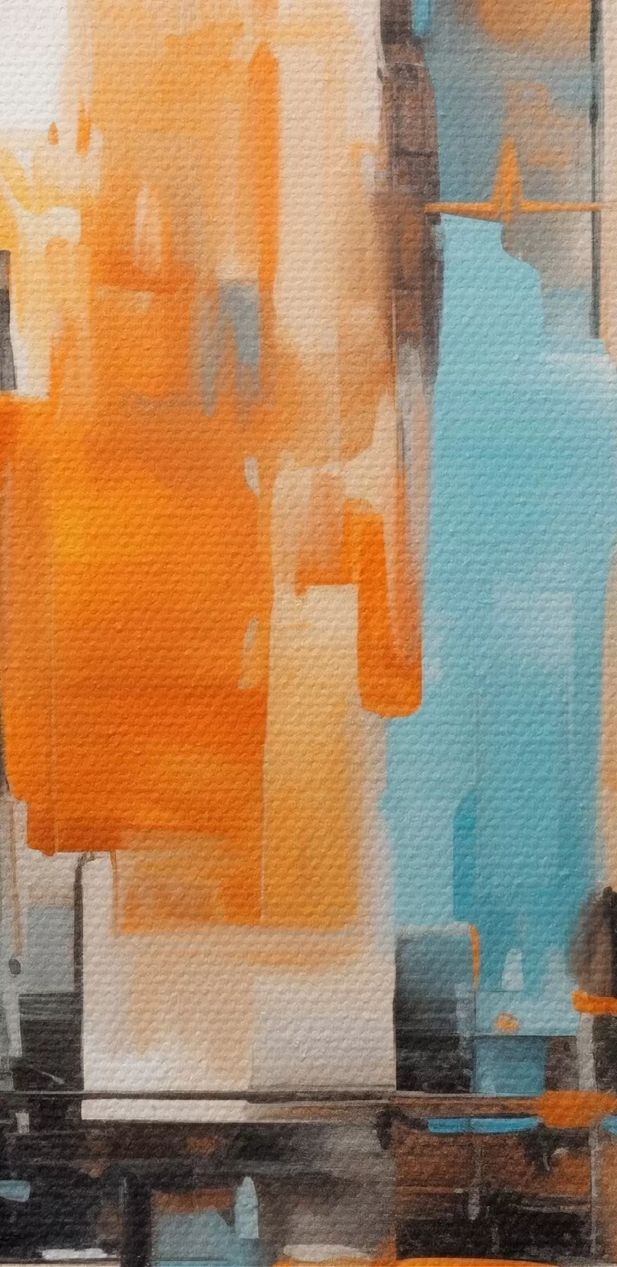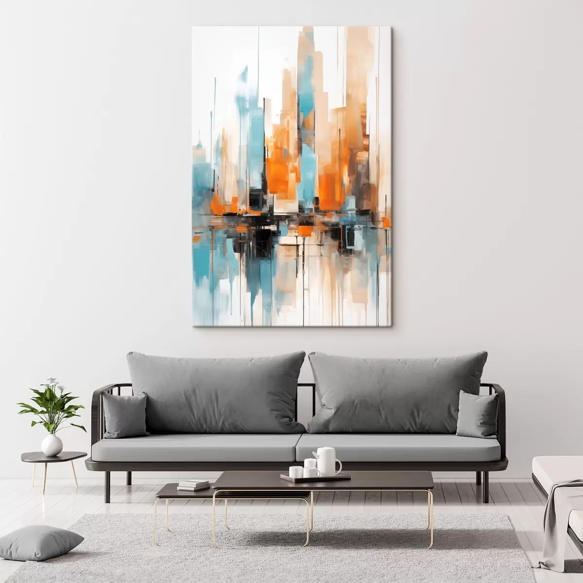 Gemälde Abstrakte Stadtlandschaft mit vertikalen Pinselstrichen in Orange-, Blau- und Weißtönen, Malstil Art. s46267