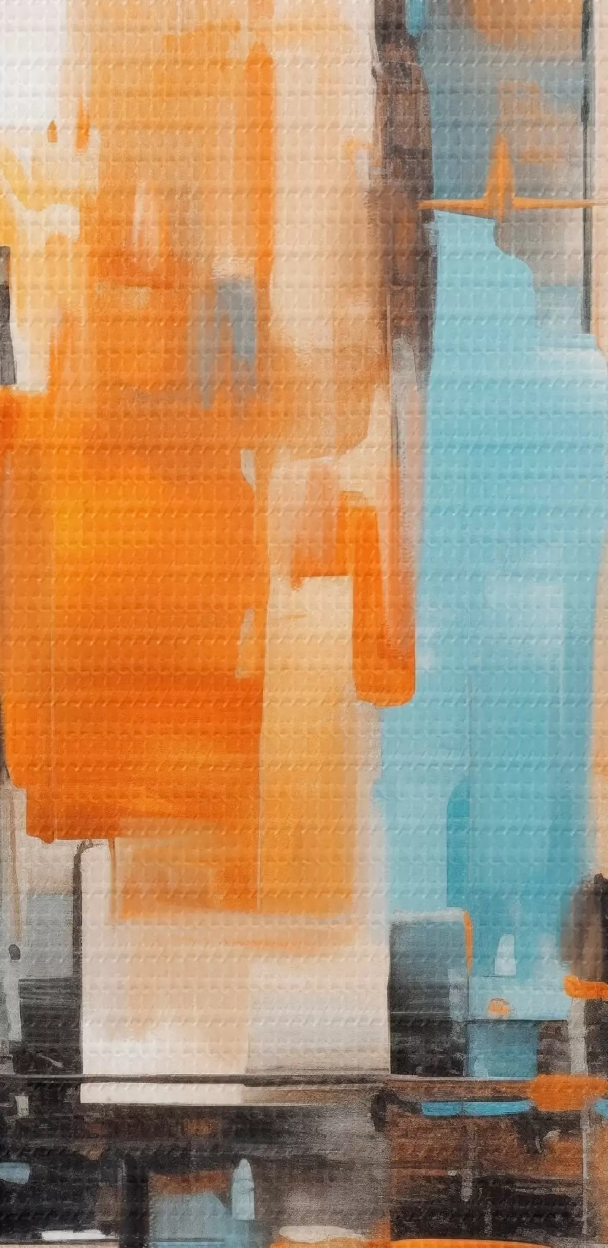 Fototapete Abstrakte Stadtlandschaft mit vertikalen Pinselstrichen in Orange-, Blau- und Weißtönen, Malstil s46267