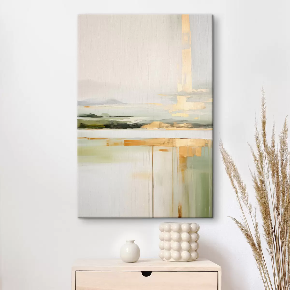 Gemälde Abstrakte Landschaft mit gelben Akzenten, eine minimalistische Komposition aus Land, Wasser und Himmel, mit gedämpften Farben Art. s46268