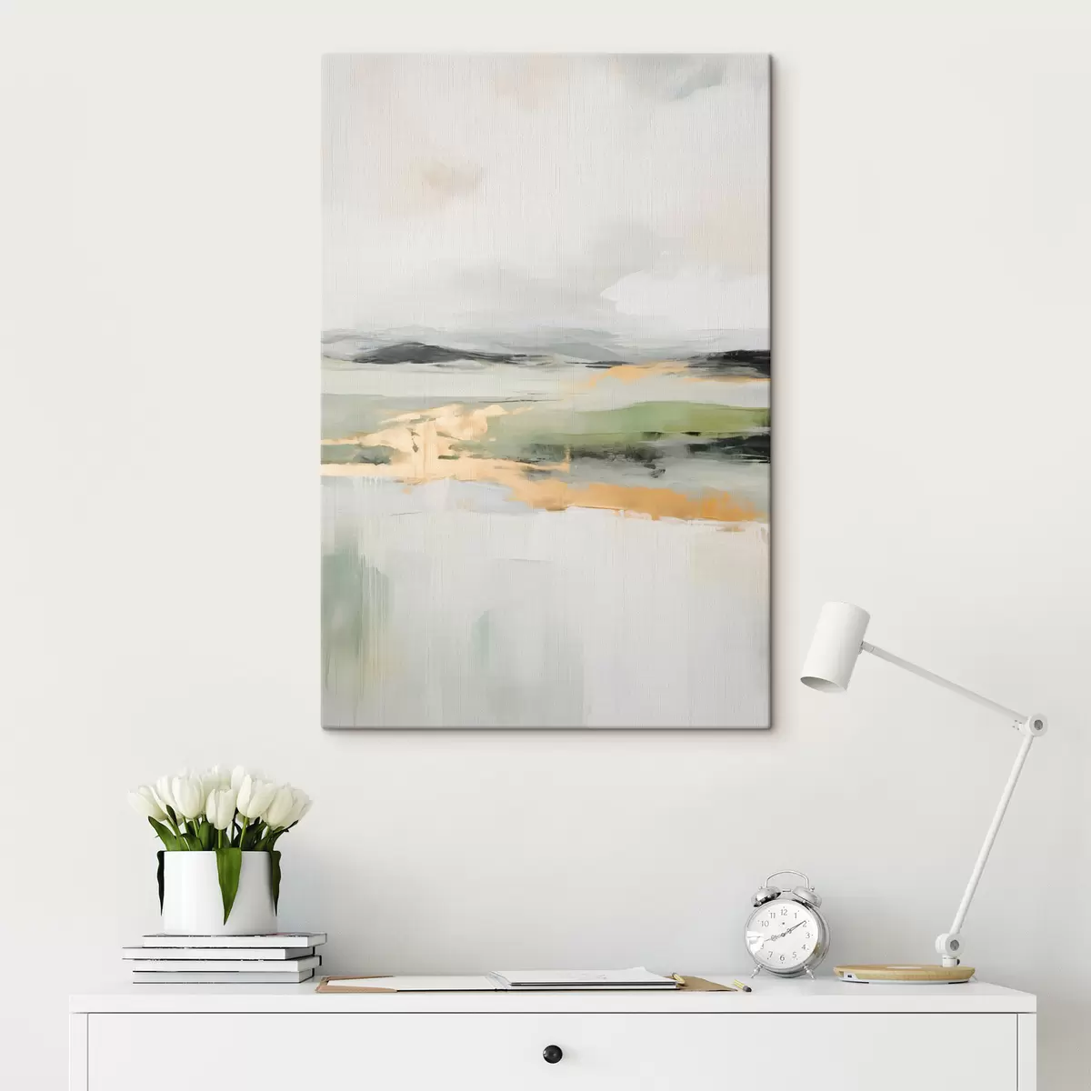 Gemälde Abstrakte Landschaft mit gelben Akzenten, eine minimalistische Komposition aus Land, Wasser und Himmel, mit gedämpften Farben Art. s46269