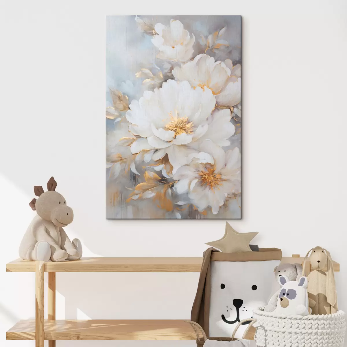 Gemälde Weiße Pfingstrosen mit gelben Blütenkernen und Blättern, sanfte Pinselstriche, hellblauer Hintergrund, Blumenarrangement Art. s46271