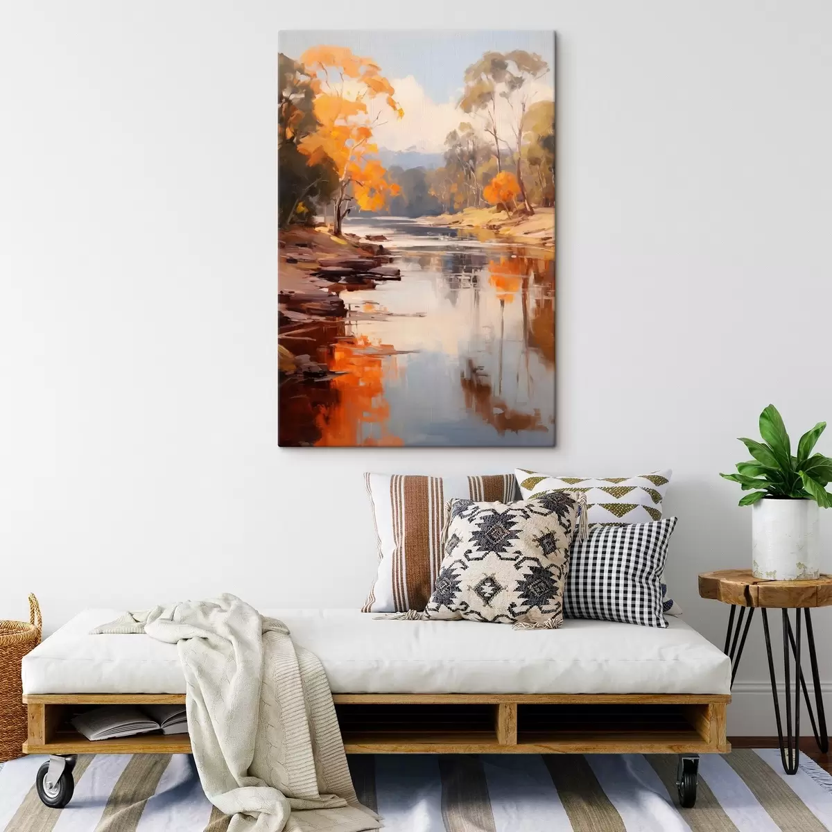 Gemälde Herbstlandschaft, Fluss mit Bäumen am Ufer, Wald im Hintergrund, Spiegelungen auf dem Wasser Art. s46280