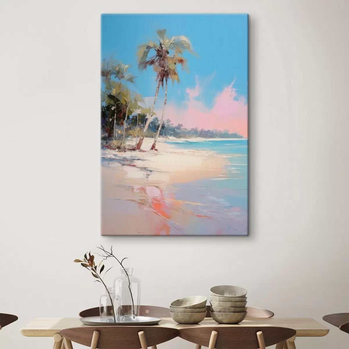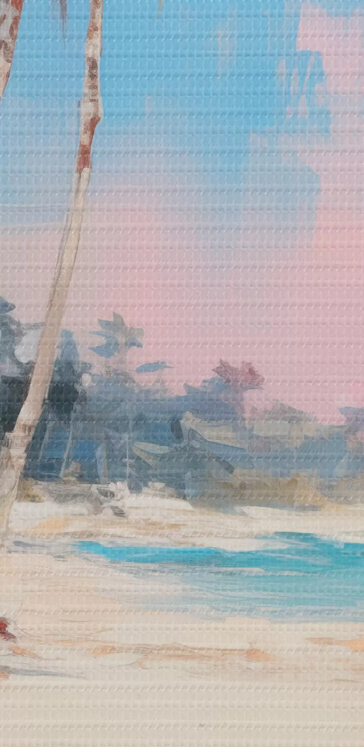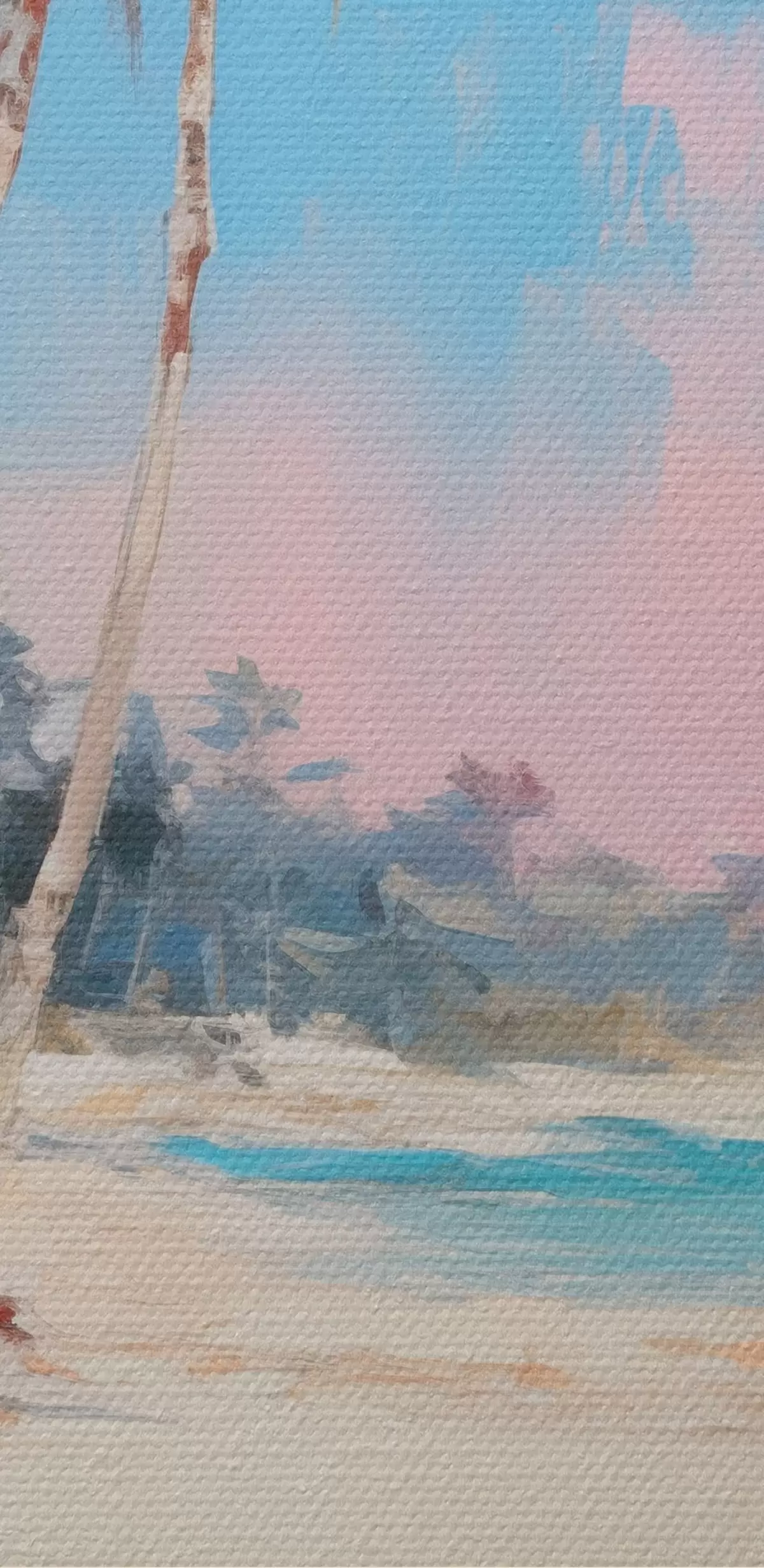 Gemälde Abstrakter tropischer Strand mit weißem Sand und Palmen, blauer Himmel mit weißen Wolken Art. s46285